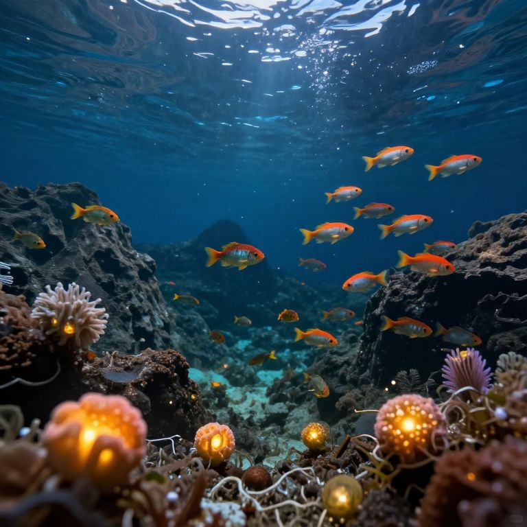 An inverted mountain cradles a subterranean world where luminous fruit glows like celestial stars, nurturing a school of vibrant fish beneath a mirrored sky, symbolizing the hidden beauty and interconnectedness of life.