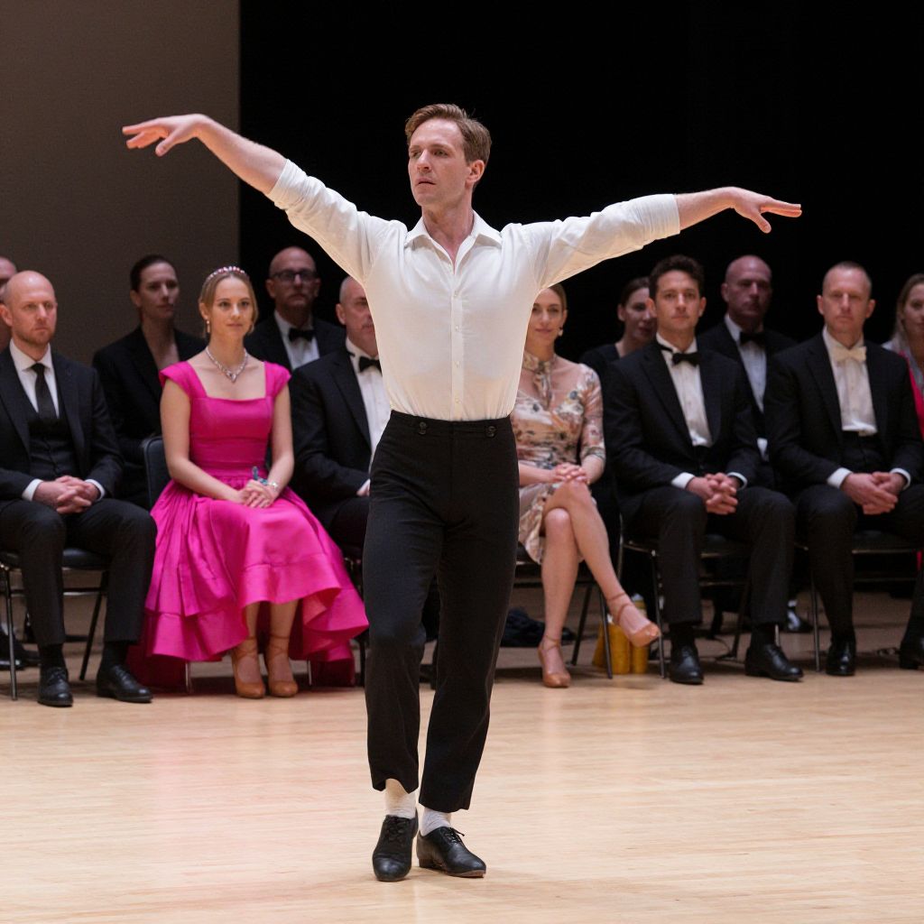 Dancer performing a French Cancan routine on stage, arms outstretched, surrounded by an audience dressed in formal attire, including a woman in a vibrant pink dress seated among them.