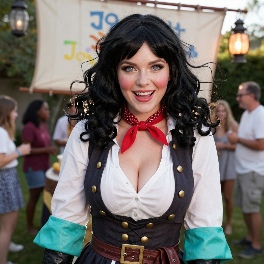 A playful, themed birthday party where a woman with wavy black wig bangs wears a whimsical pirate costume with a red bandana and sea-green boots; the setting is a sunny backyard with a painted boat sail and lanterns, her face is cheerful with freckles, rosy cheeks, and bright blue eyes, the wig gently waves in the warm breeze as she laughs with friends in the background.. The woman has big tits and cute face
