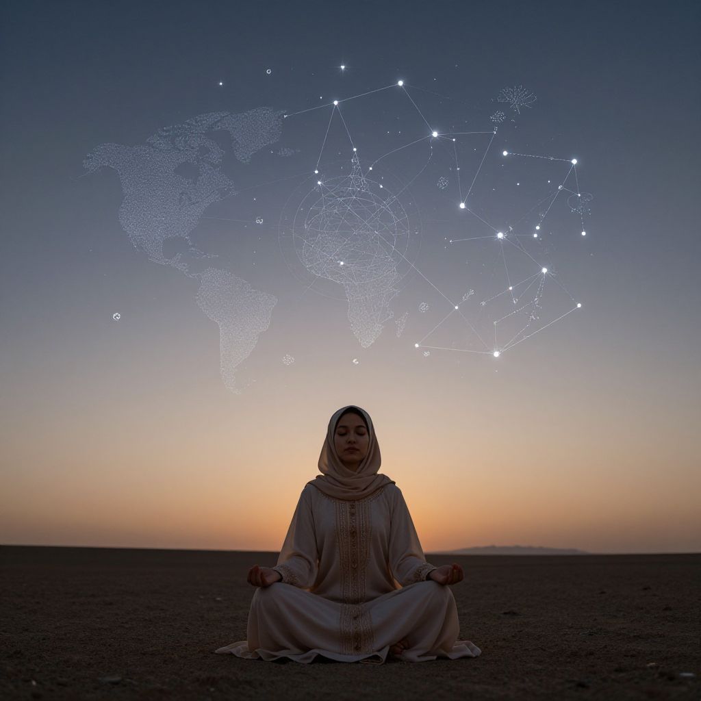 Islami prompt: A young Muslim woman in flowing traditional attire meditating under a vast open sky during dusk, with stars forming a celestial map inspired by Islamic astronomy.