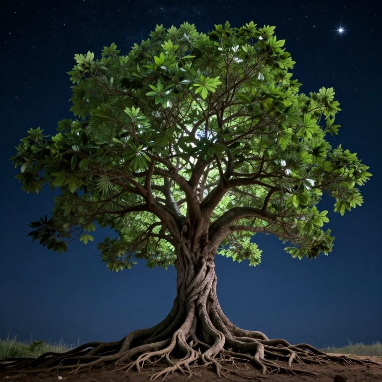 An ancient tree stands as a celestial beacon, its roots anchoring the earth while its branches reach toward the cosmos, each leaf a whisper of silence echoing the infinite symphony of existence.