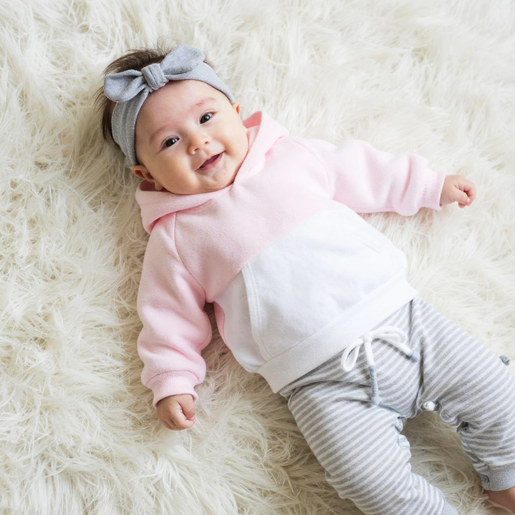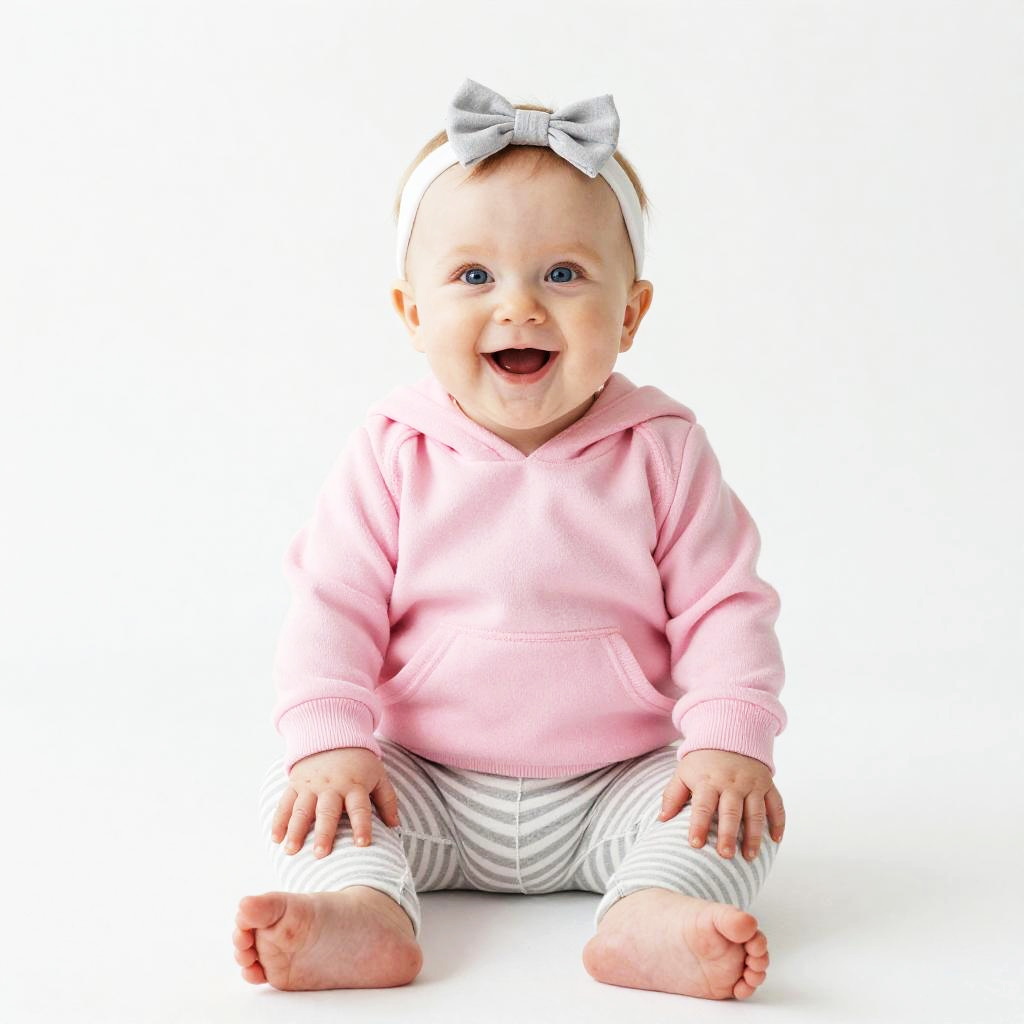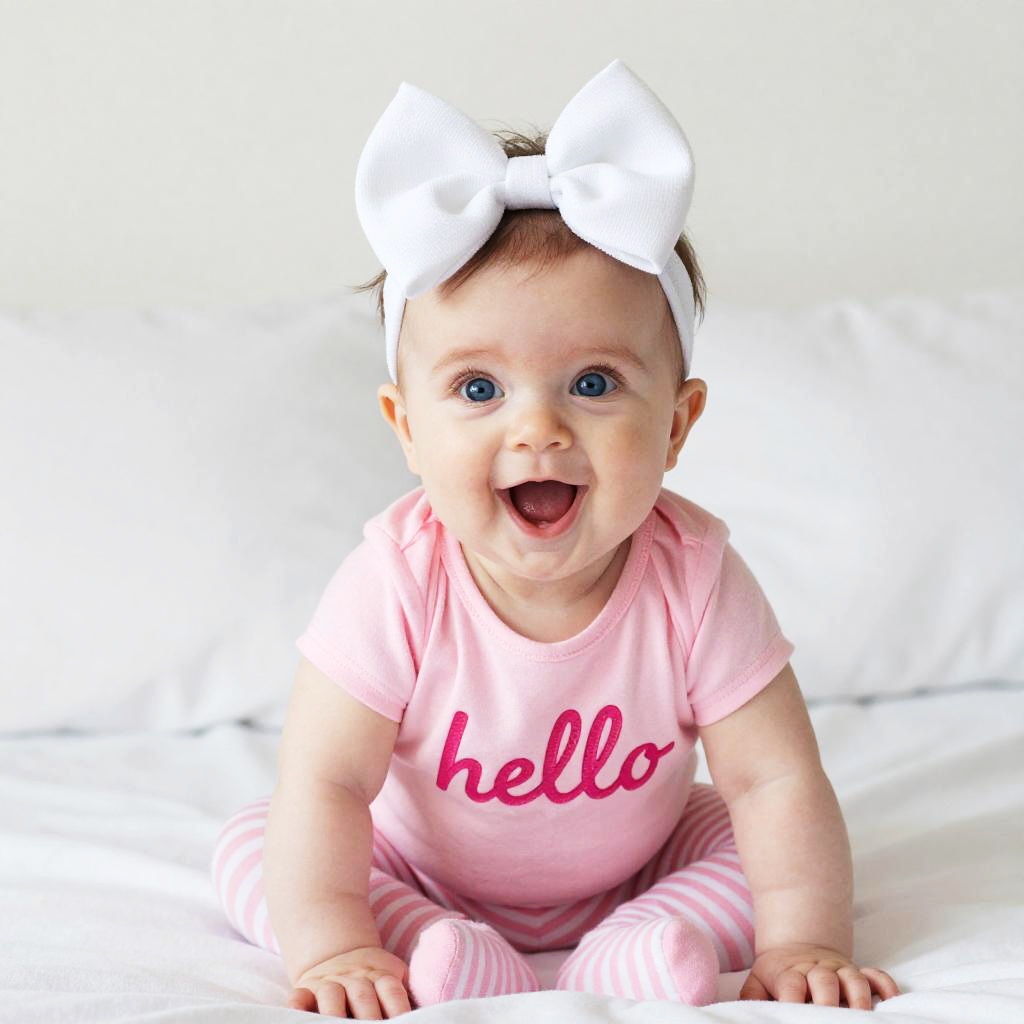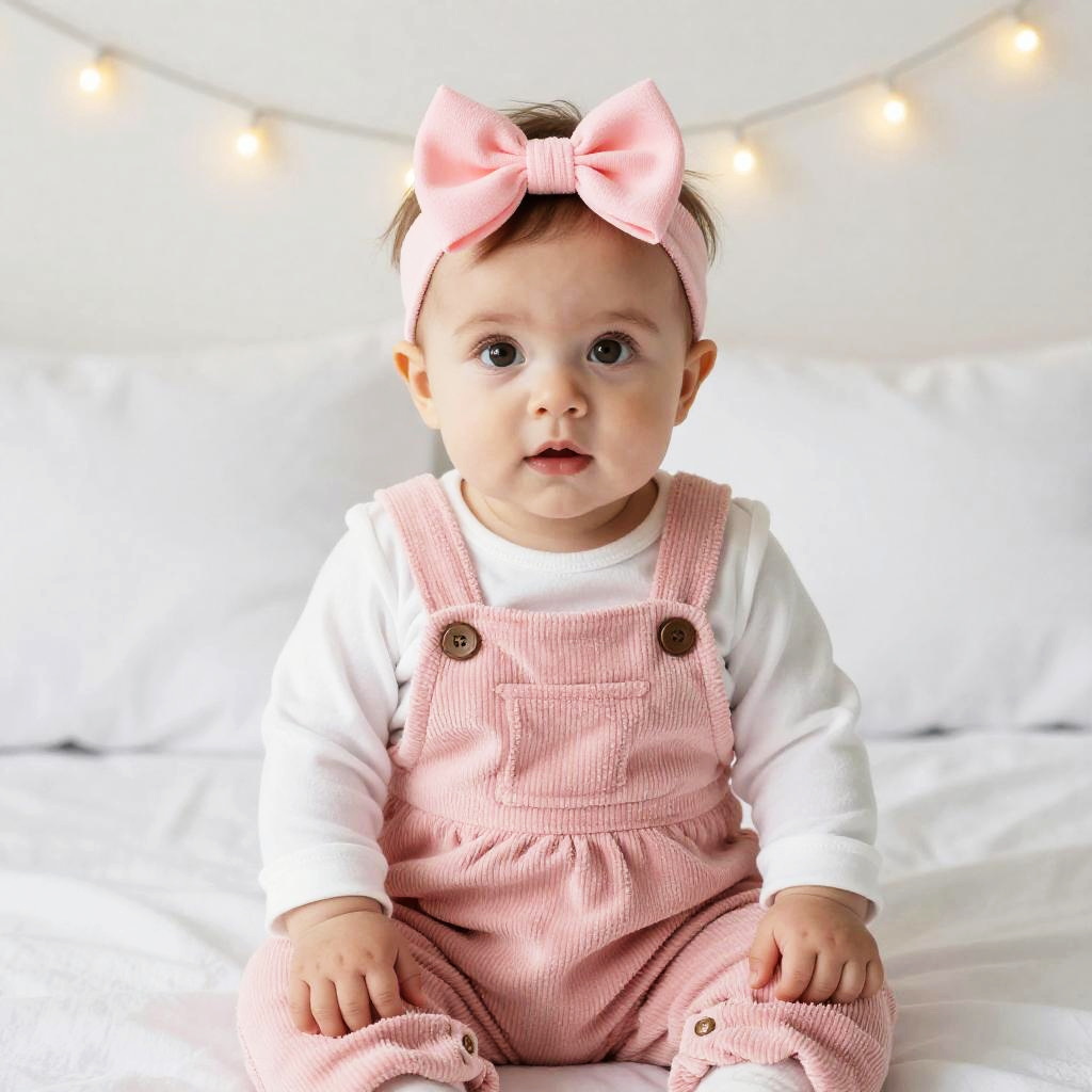 Photograph of a cute baby with light brown curly hair, wearing a pink headband with a bow, matching pink short-sleeve shirt with bow accents, and pink leopard-print shorts. The baby is sitting against a white background. Surrounding the baby are various matching pink and white bow accessories, including a headband, shirt, and round wooden decoration. The baby looks to the right.