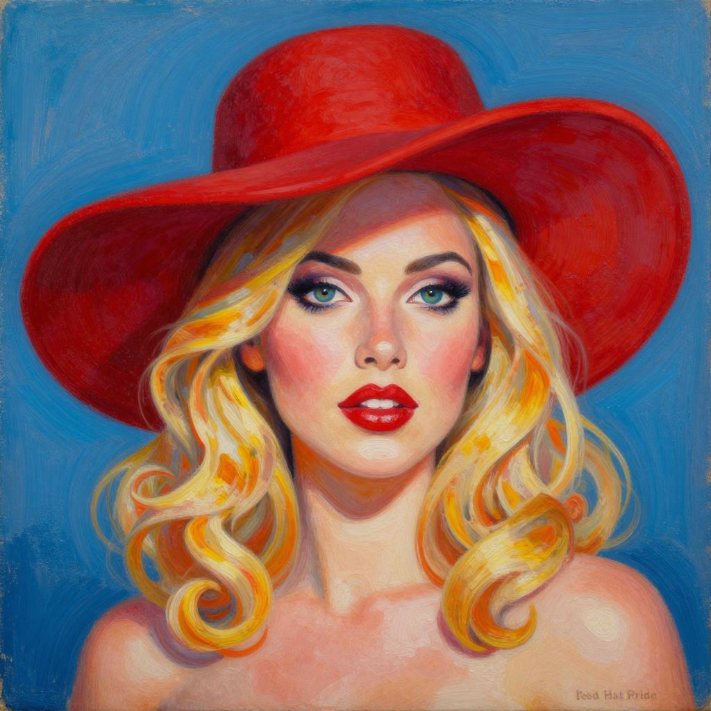 Vibrant oil painting print titled 'Red Hat Pride' by Linda Hass, featuring a woman with radiant blonde curls and a bold red hat, rendered with vivid colors and lifelike detail.