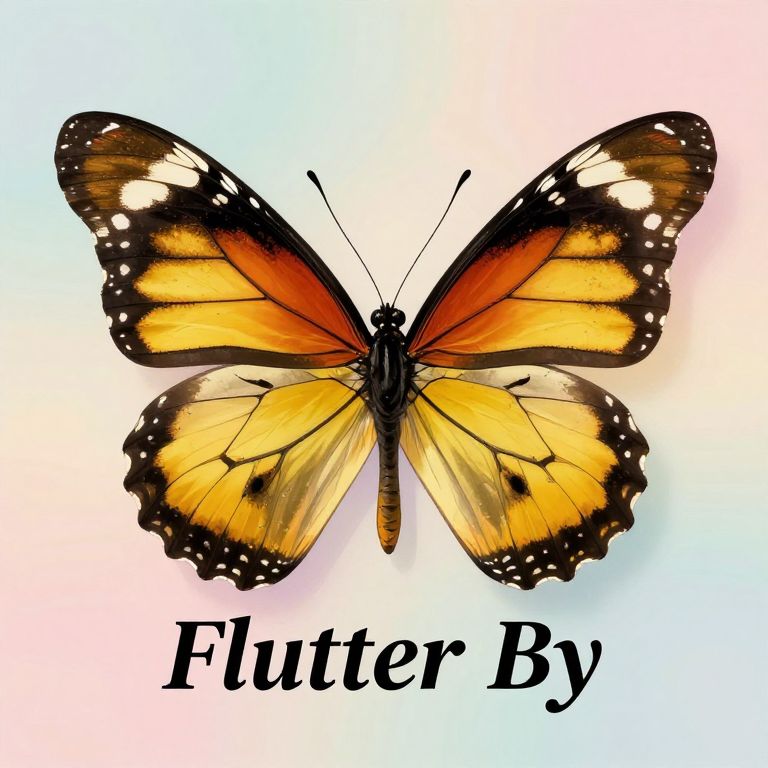 Photograph of a vibrant orange and black butterfly with white spots, labeled "Flutter By" in black text on a gradient white-to-pink background