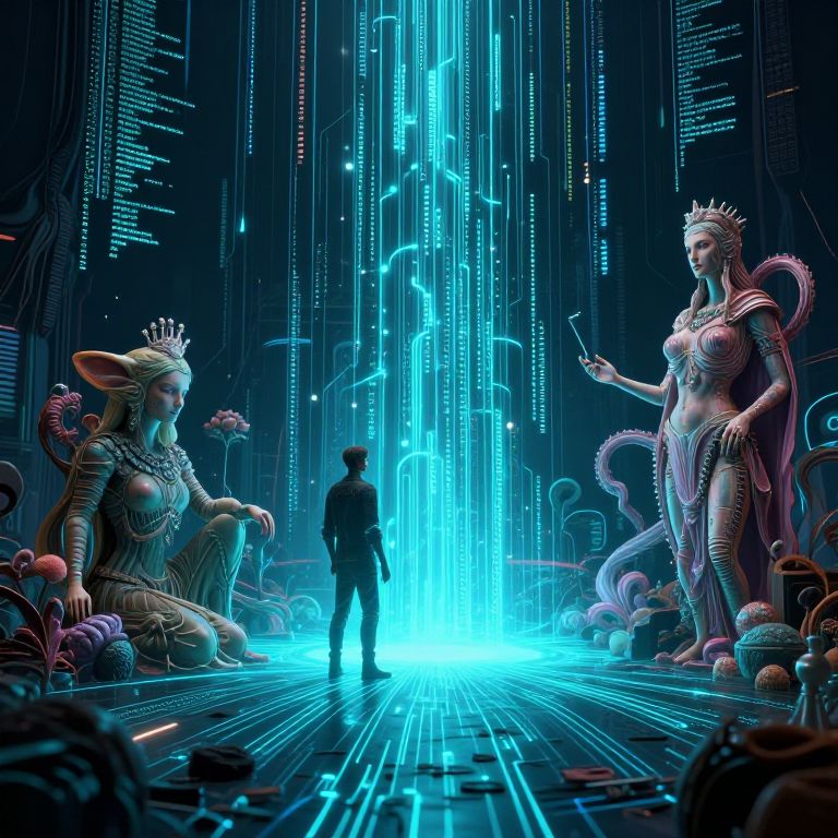 Digital artwork of a futuristic scene with a small human standing between two towering, glowing, cybernetic goddesses, surrounded by neon lights and glowing blue