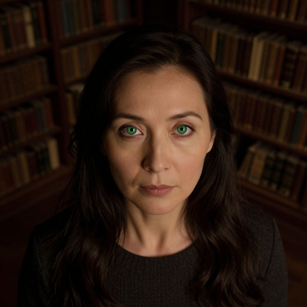 Envision an ultrarealistic portrait of a middle-aged Central Asian woman with captivating green eyes and an enigmatic aura set against an ancient library's backdrop. From a bird's-eye view, her gaze meets the viewer's, drawing them into a world of secrets. The subtle shadows cast by dim amber lighting enhance her mysterious features, evoking nostalgia and intrigue.