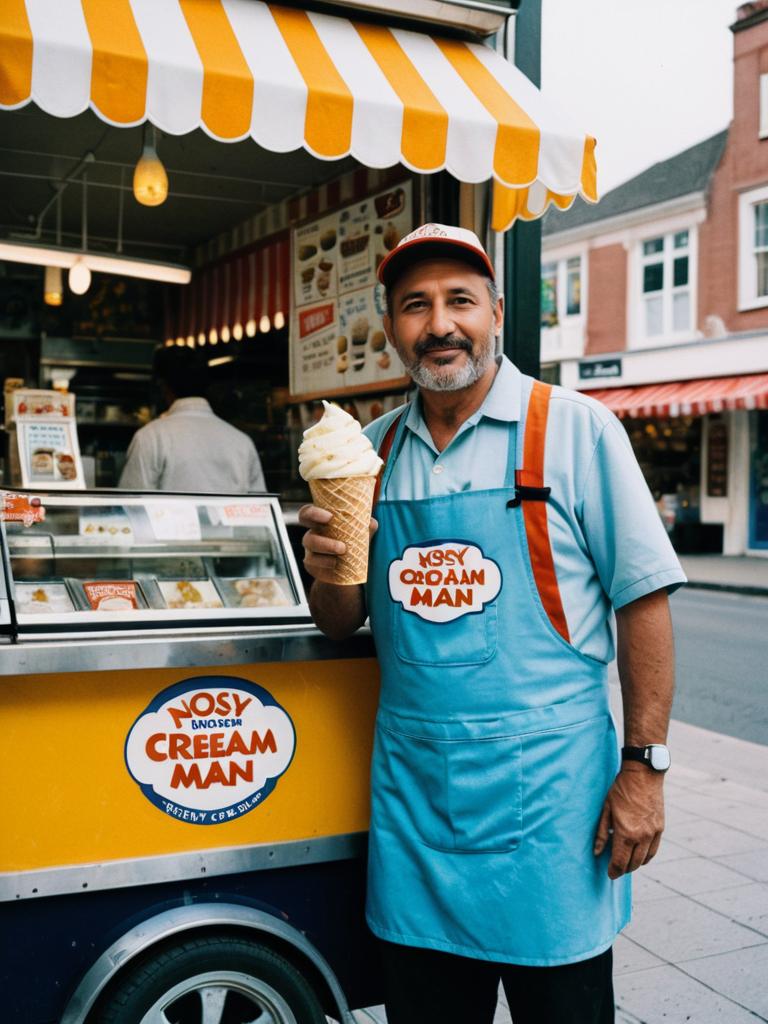 Man in Ice Cream Vendor Costume, photorealistic outdoor portrait with shop backdrop