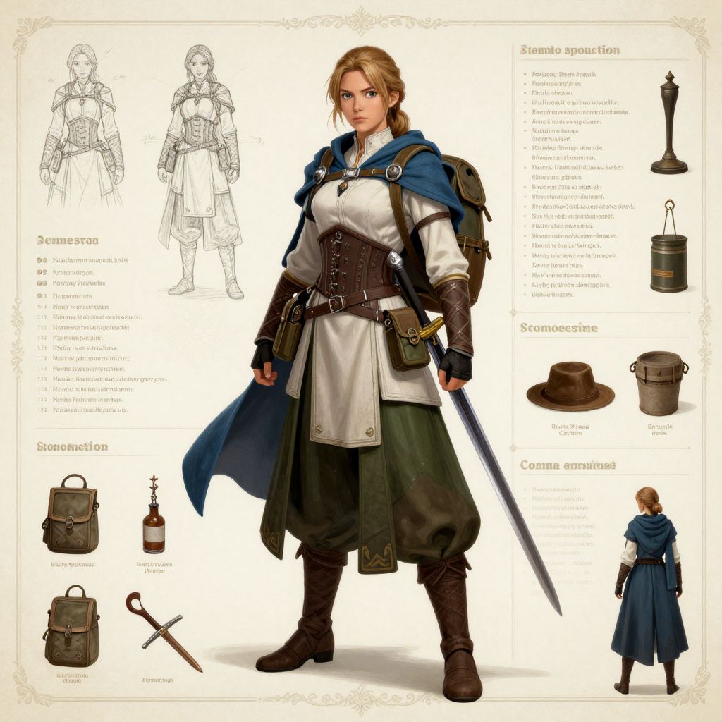The image presents a detailed character sheet for a medieval woman adventurer. The character is depicted in a dynamic pose, standing with a confident stance. She is equipped with a backpack, side bags, and a sword, suggesting readiness for an expedition. Her attire includes a white tunic, a green skirt, and brown boots, complemented by a blue cloak draped over her shoulders. The character's hair is styled in a braided ponytail, adding to her adventurous appearance. The character sheet includes various sketches and illustrations of her outfit, providing a comprehensive view of her appearance from different angles. The background features a detailed list of items and equipment, indicating the character's preparedness for her journey. The overall composition is well-organized, with the character and her equipment clearly highlighted, creating a cohesive and informative visual representation.