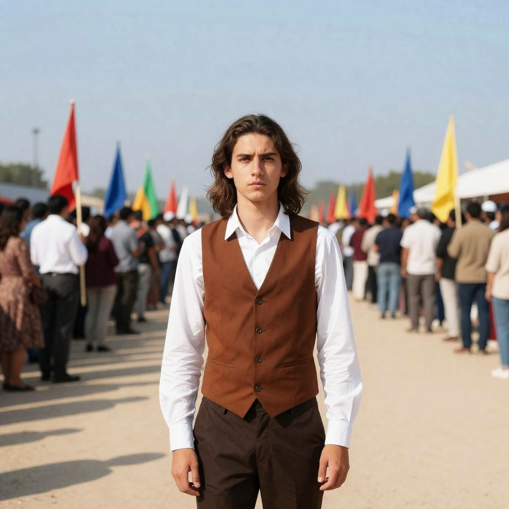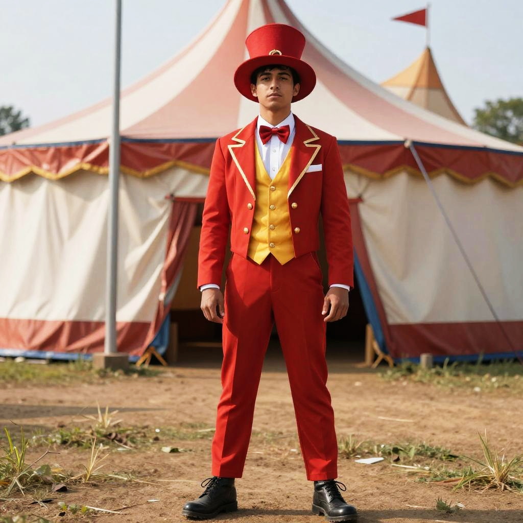 Young man dressed as a carnival ringmaster wearing a red top hat, red jacket with gold trim, yellow vest, white shirt, red bow tie, and red pants. He is standing in front of a traditional circus tent with red, white, and yellow stripes on a sunny day.