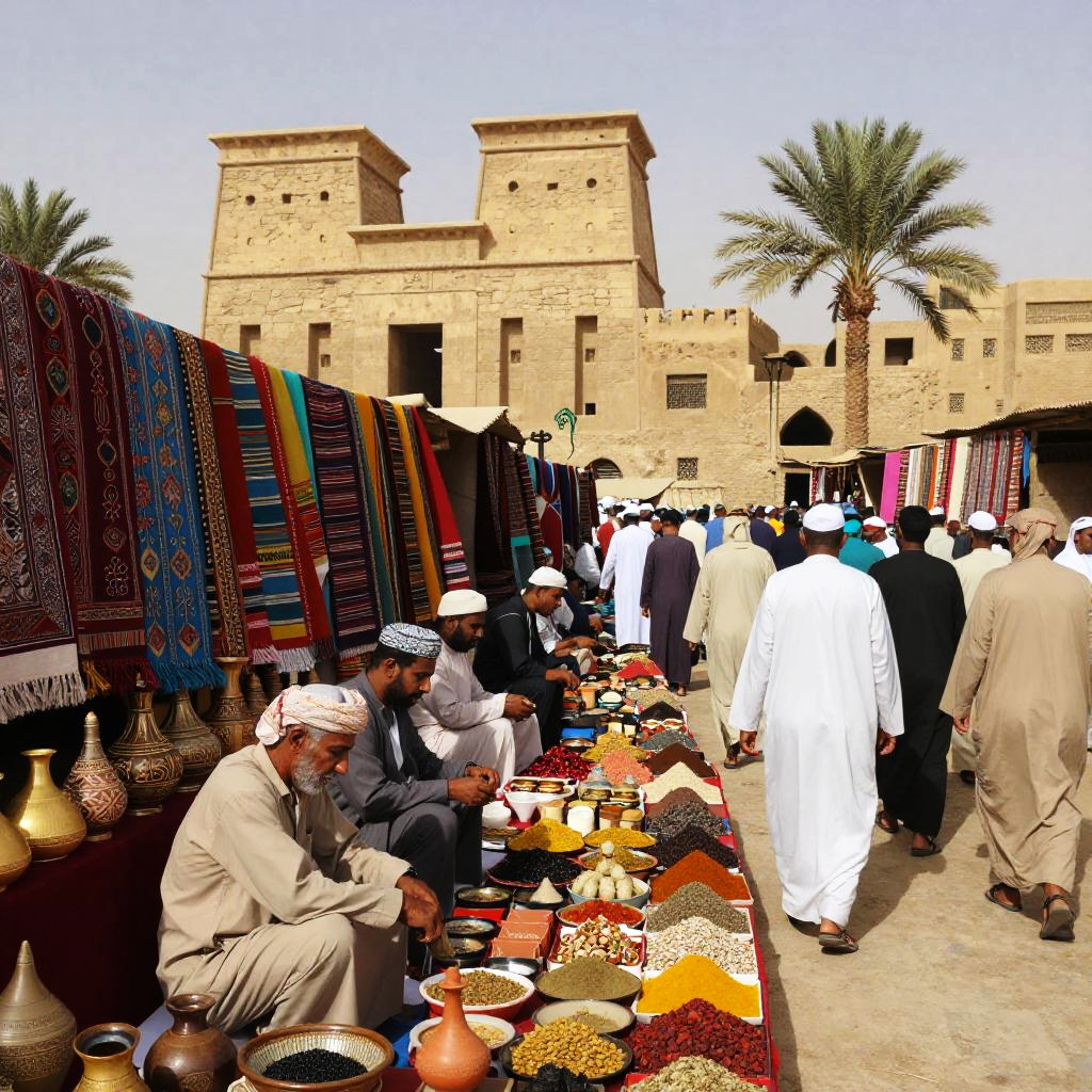 Egyptien market bustling with traders and artisans, colorful fabrics, pottery, and spices displayed, lively crowd wearing traditional clothing, backdrop of ancient sandstone buildings and date palms under bright sunlight, warm and textured details.