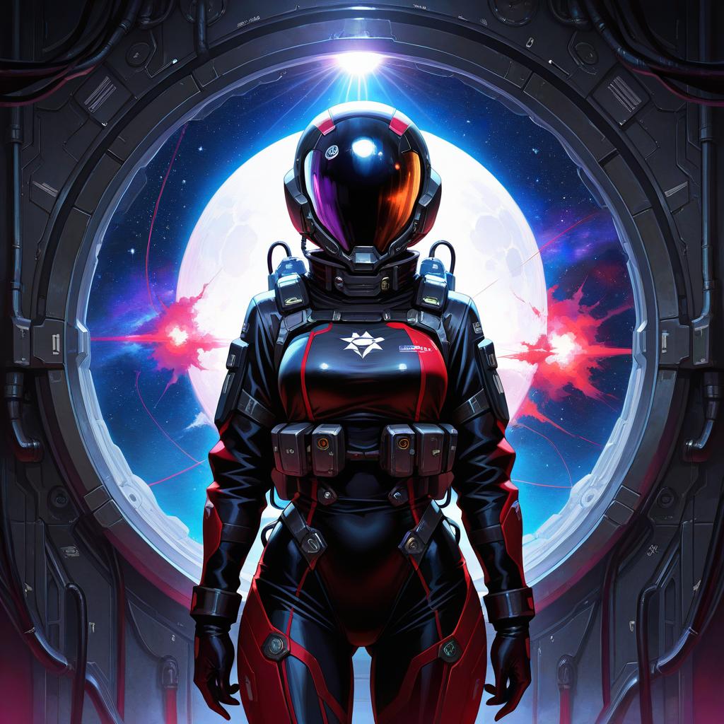 (masterpiece, top quality, best quality, extreme detailed, highest detailed, official art, beautiful and aesthetic:1.2), colorful, cowboy shot, beautiful face, solo, perfect body, 1girl, in space, spacecraft, spacesuit, sun rays, indoors, (wires and cables:1.1), (science fiction:1.2), porthole, illuminator, stars, fantasy, high contrast, ink strokes, explosions, over exposure, purple and red tone impression, abstract, ((watercolor painting by John Berkey and Jeremy Mann )) brush strokes, negative space