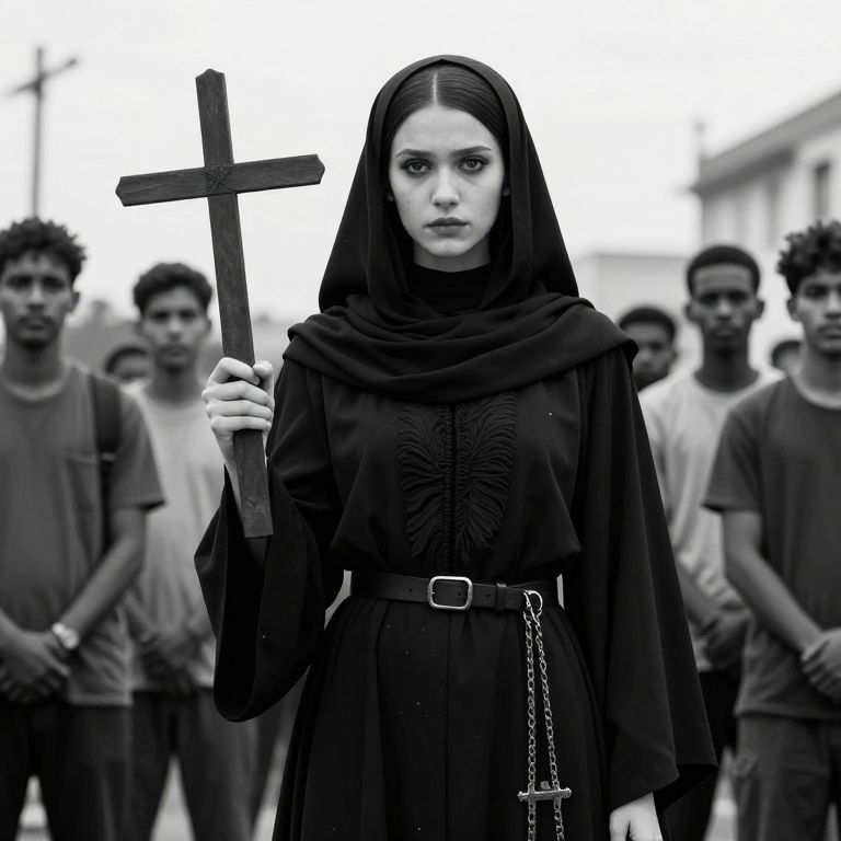 Nun Movie, nun in black and white outfit holding a cross in front of a group of people