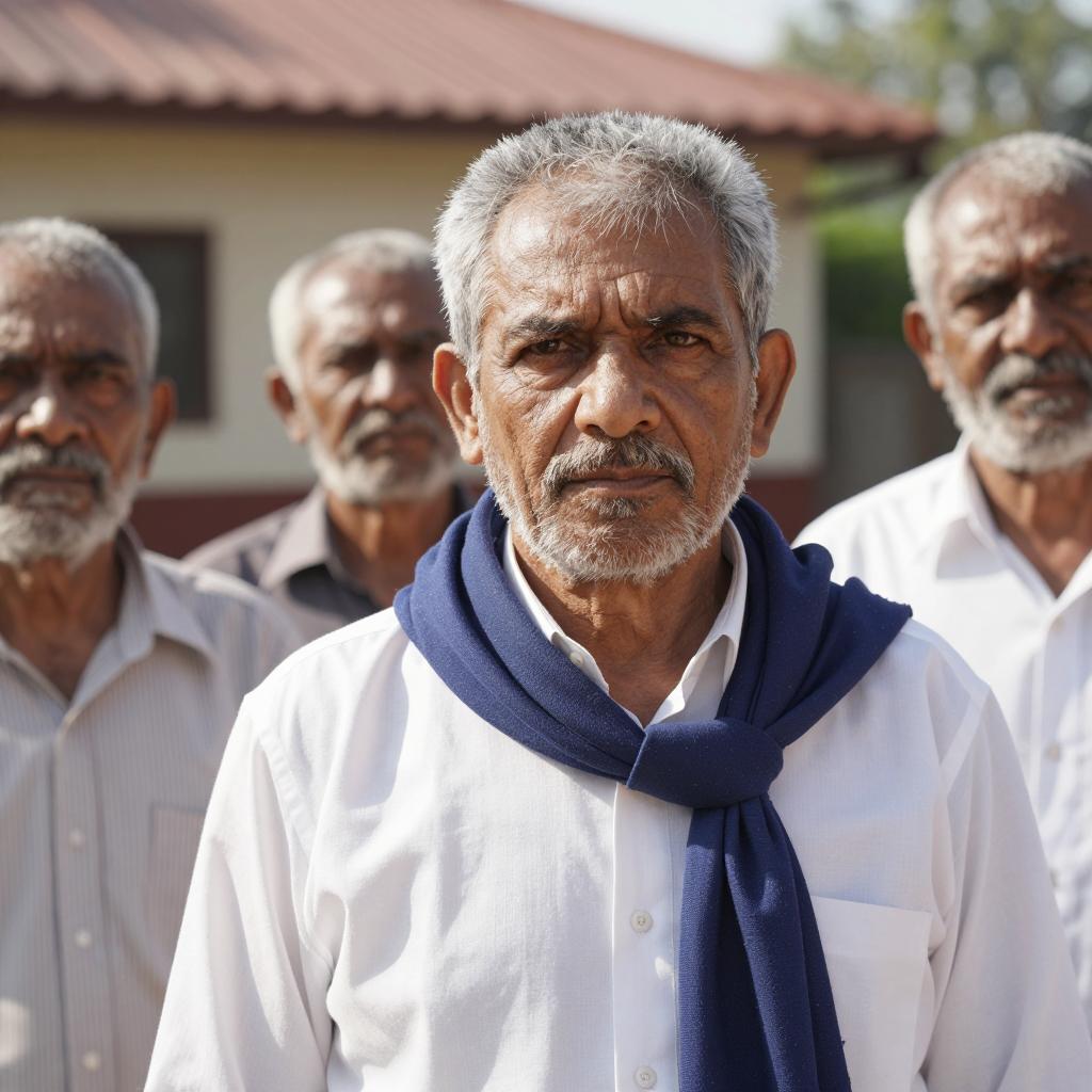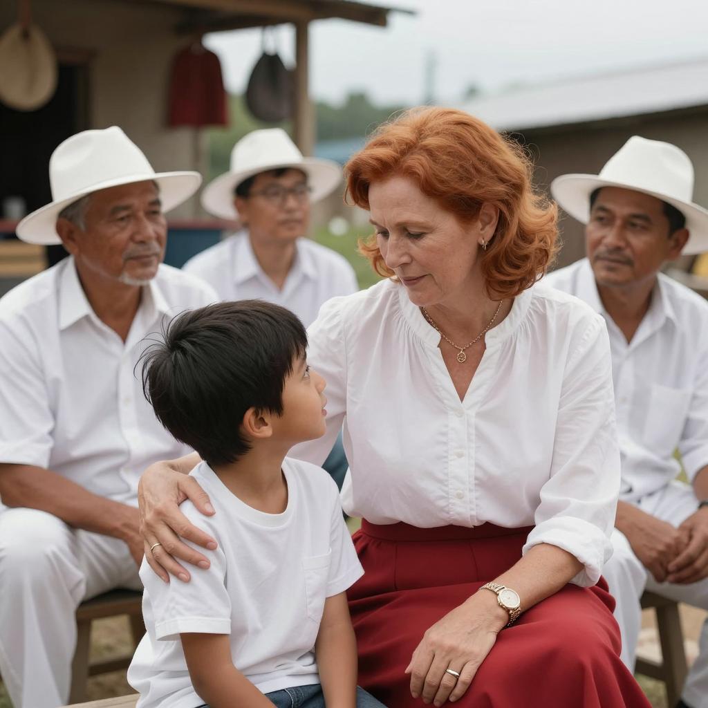 Group of people sitting under a market stall. Woman with blonde hair, covering face with hand, wears beige shirt. Young boy in beige shirt sits to her left. Elderly man with white cap and glasses sits behind her. Several men in white shirts and hats. Market stall with colorful fabrics overhead. Sunny outdoor setting. Multiple people have concerned or tired expressions.