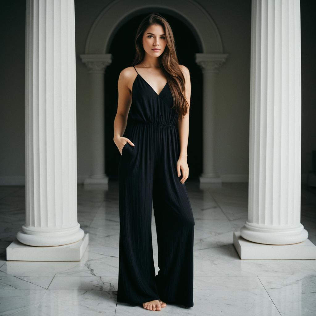 Black romper jumpsuit,1girl, solo, long hair, realistic, dress, brown hair, barefoot, black dress, lips, brown eyes, pillar