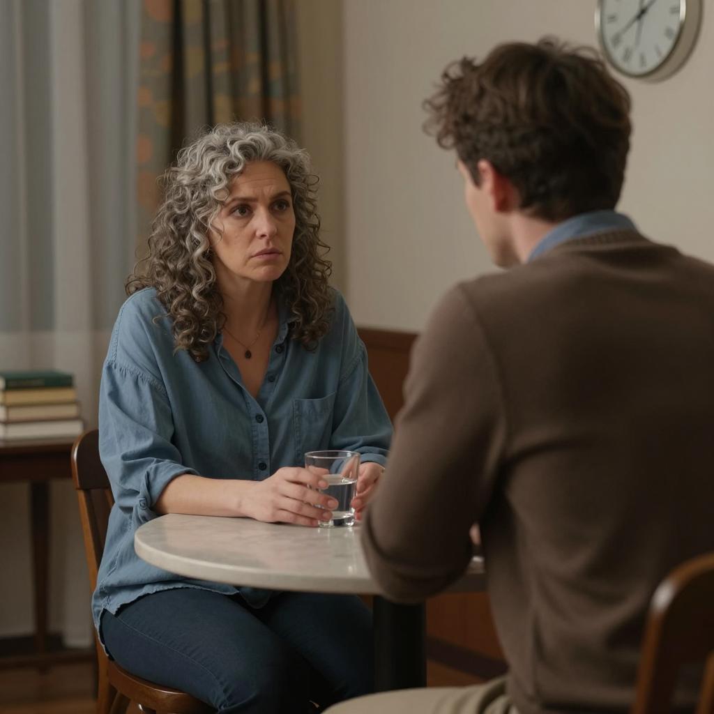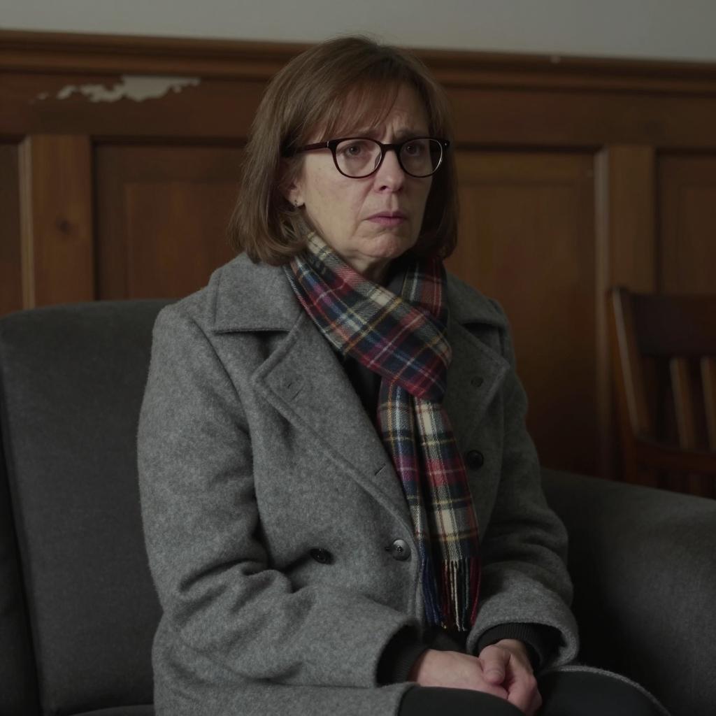 Middle-aged woman with curly brown hair, wearing a maroon cardigan over a beige shirt, sits in a dimly lit room. Shadows of leaves pattern the wall behind her. She has a concerned expression, looking to the right. Metal bed frame and white pillows in the background. Photograph.