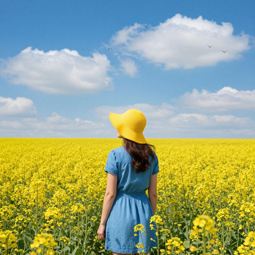 Woman in a vibrant yellow hat and blue dress stands contemplatively amidst a golden field of blooming rapeseed, her gaze directed toward the horizon under a vivid sky dotted with fluffy clouds and soaring birds, evoking a serene rural landscape.