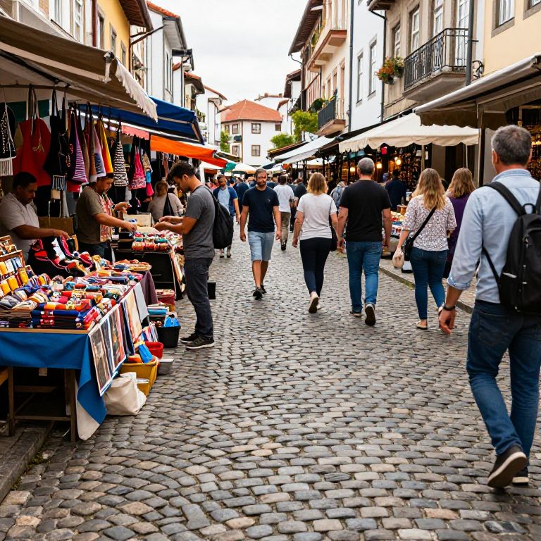 Cobblestone pathways in a bustling market street, vendors selling colorful goods, diverse crowd, lively energy, warm daylight, detailed textures, urban historic charm