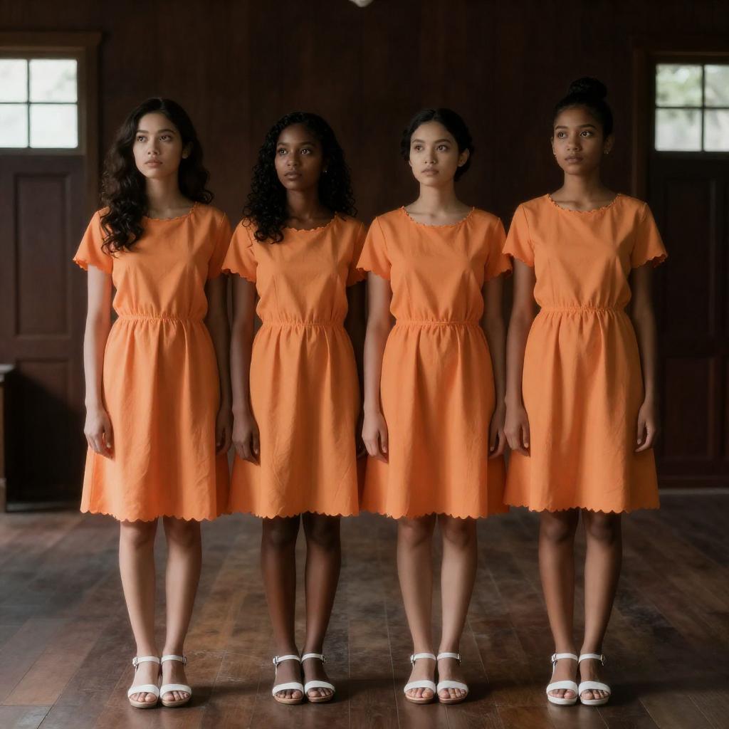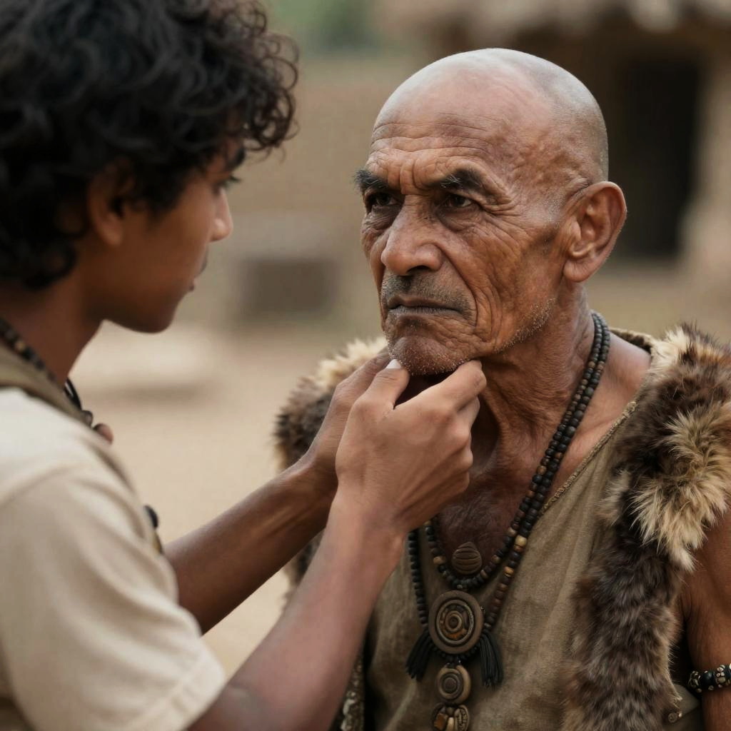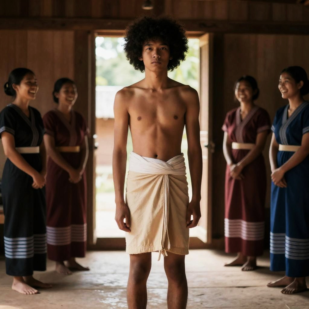 A topless young Asian man with a large black Afro, wearing beige loincloth and a white waistband, stands in a wooden room. Group of laughing Asian women in traditional clothes stand in the doorway. Sunlight filters through window.