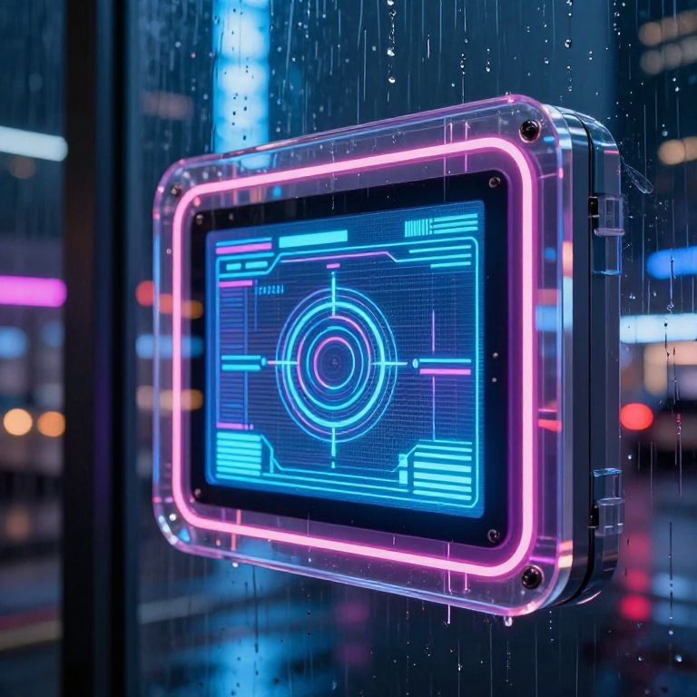 A photograph of a neon-lit, rectangular digital display panel with a glowing blue holographic interface centered on a black background. The panel is bordered by a pink neon frame and mounted on a rain-soaked glass surface. The holographic interface features concentric circles with lines radiating from the center. The background is blurred, showcasing city lights in blue, pink, and red hues. The raindrops on the glass add a dynamic, wet texture, enhancing the futuristic, cyberpunk aesthetic.