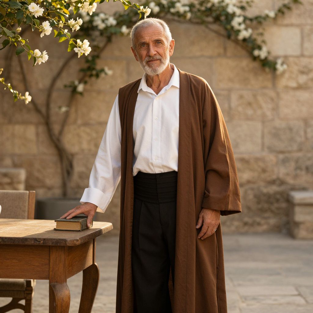 A man in his late 30s with a warm, weathered face and a kind gaze stands in a sunlit courtyard. He wears a brown robe draped over his shoulders, a crisp white shirt underneath, and black pants that fit snugly at the waist. The robe flows slightly in the breeze, and his hands are resting on a wooden table beside a small book. The background features ancient stone walls and blooming jasmine vines, creating a serene, timeless atmosphere. The scene is softly lit with golden hour sunlight, evoking a sense of wisdom and quiet reflection.