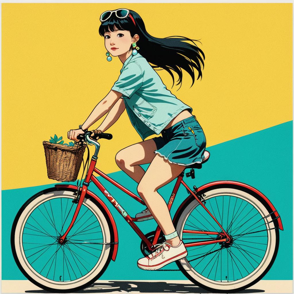 Illustration of a cool anime-style girl wearing pearl earrings and sunglasses on her head, dressed in a turquoise shirt and denim shorts, riding a red bicycle with a wicker basket containing green plants. The background features bold yellow, turquoise, and white colors.