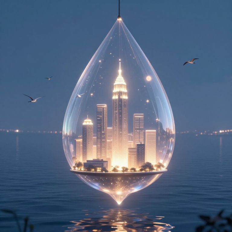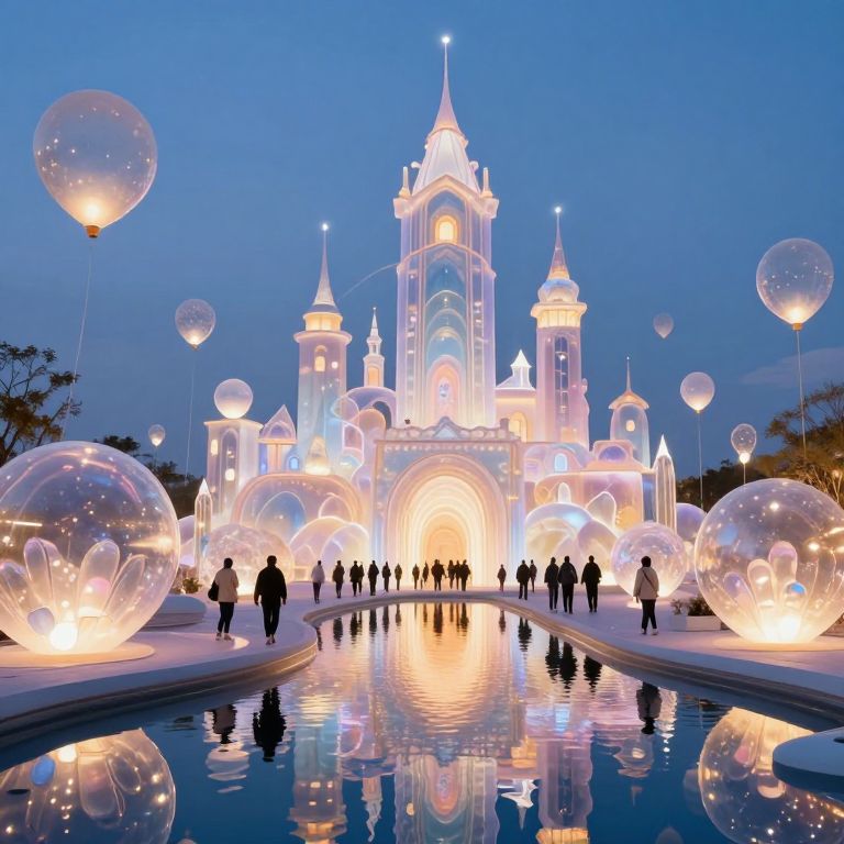 A mesmerizing 3D-rendered fantasy scene depicts a luminous city constructed from translucent, glowing soap bubbles, illuminated by warm, ethereal light against a twilight sky, as figures stroll along a reflective water surface, capturing the magical interplay of light and shadow in a surreal, otherworldly atmosphere.