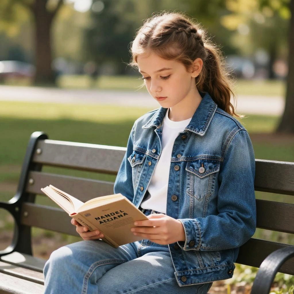12 year old girl pretty, sitting on a park bench reading a book, casual stylish outfit with a denim jacket, natural makeup, serene expression, dappled sunlight filtering through trees
