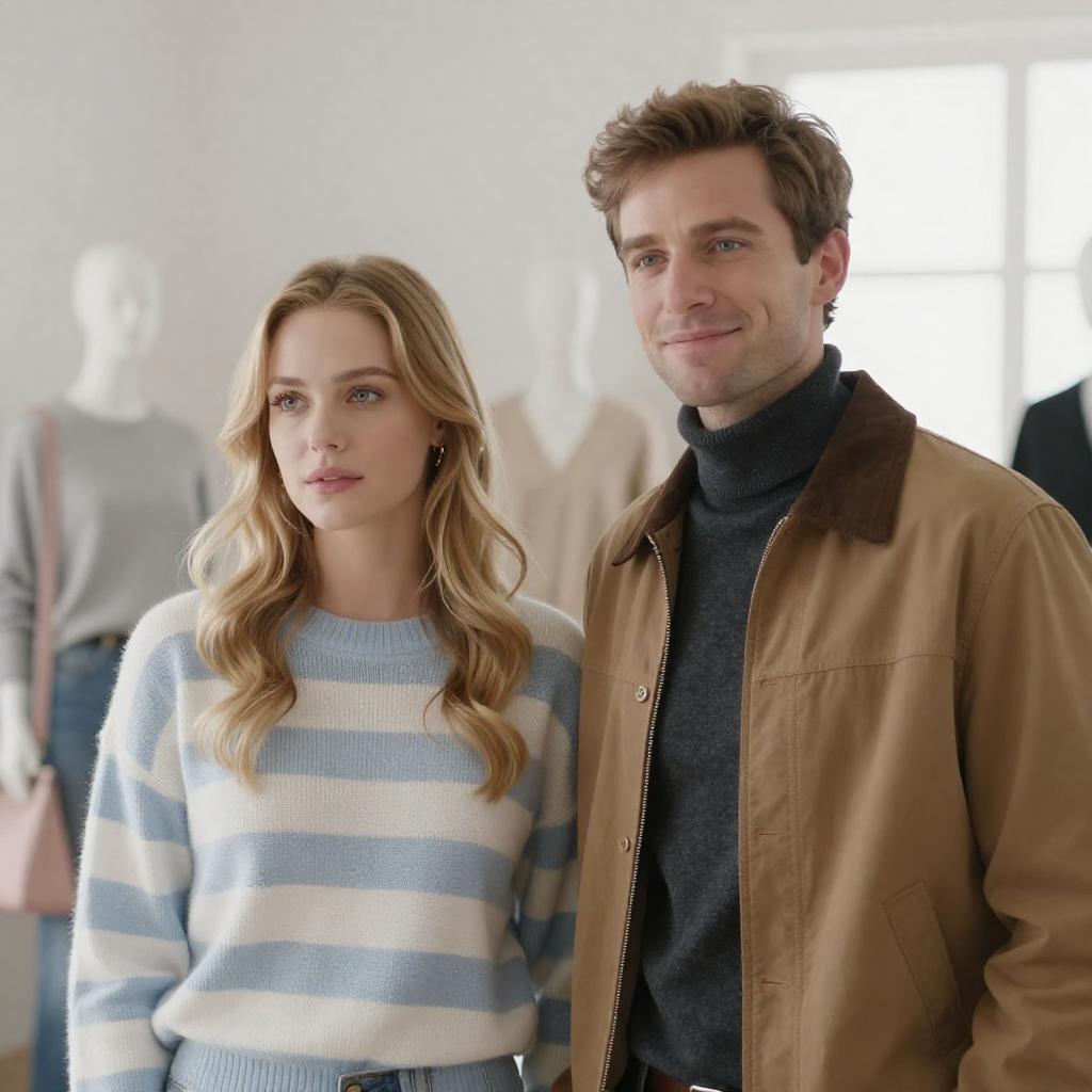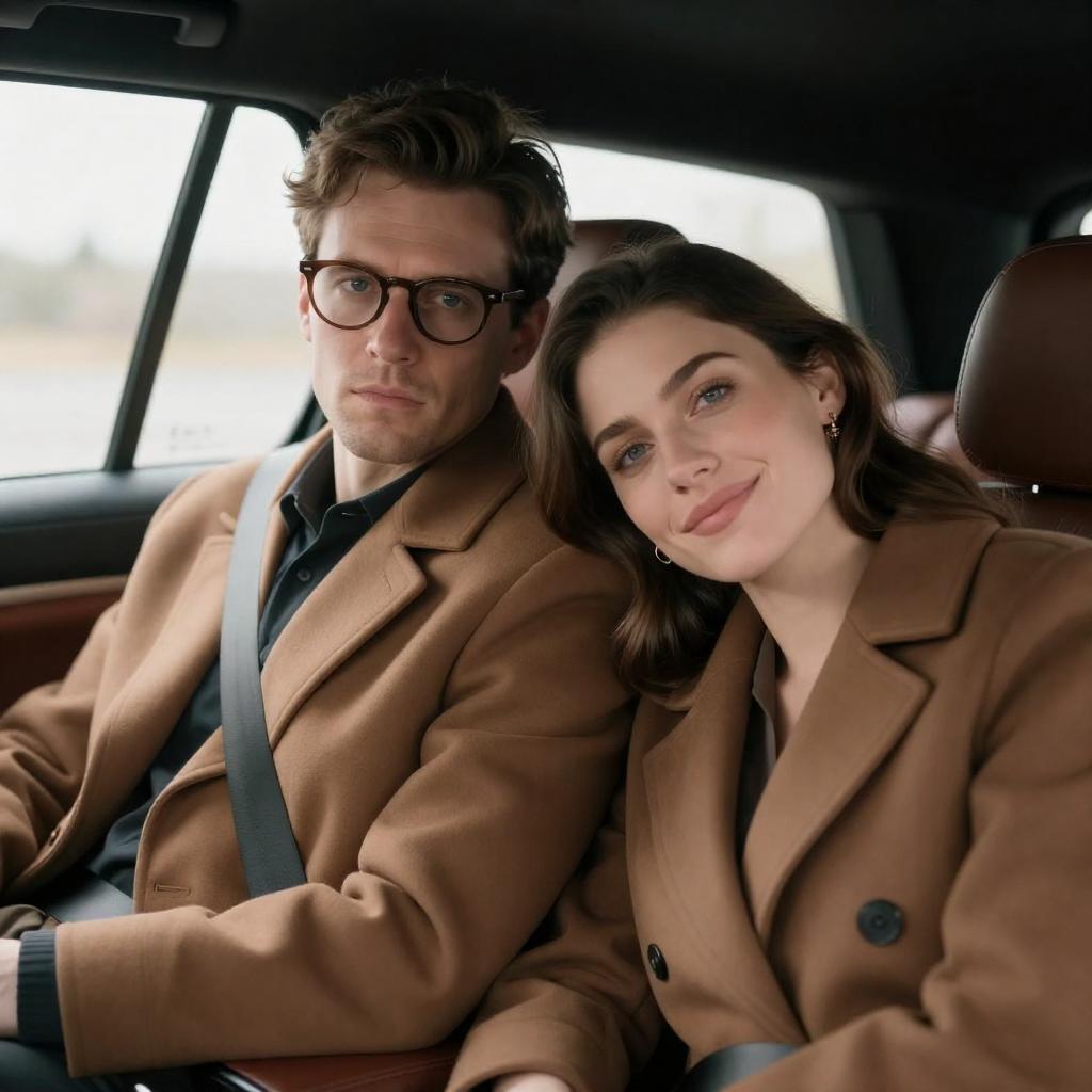 Photograph of a man and woman sitting in a car. Man with brown hair, glasses, brown coat, serious expression. Woman with brown hair, blue eyes, brown coat, leaning on man, smiling. Brown leather car seats in background. Man's left arm around woman's shoulders. Man on left, woman on right. Bright light from window on left.