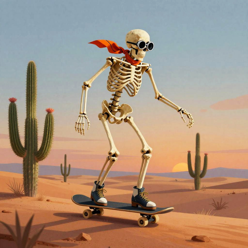 A cactus-filled desert with a young skeleton skating downhill swiftly, wearing a hand-painted clay sombrero, illustrated in Ukiyo-e style, deep magenta and golden sunset skies, rocky desert with scattered cacti, high detail, fantasy art with glowing ambient light, minimalistic yet vibrant colors
