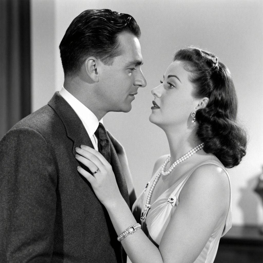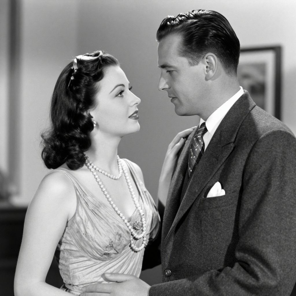 A vintage black-and-white photograph captures a classic 1940s scene featuring a man in a suit and a woman in an elegant pearl-adorned dress, exuding a timeless, retro charm reminiscent of mid-century cinema.
