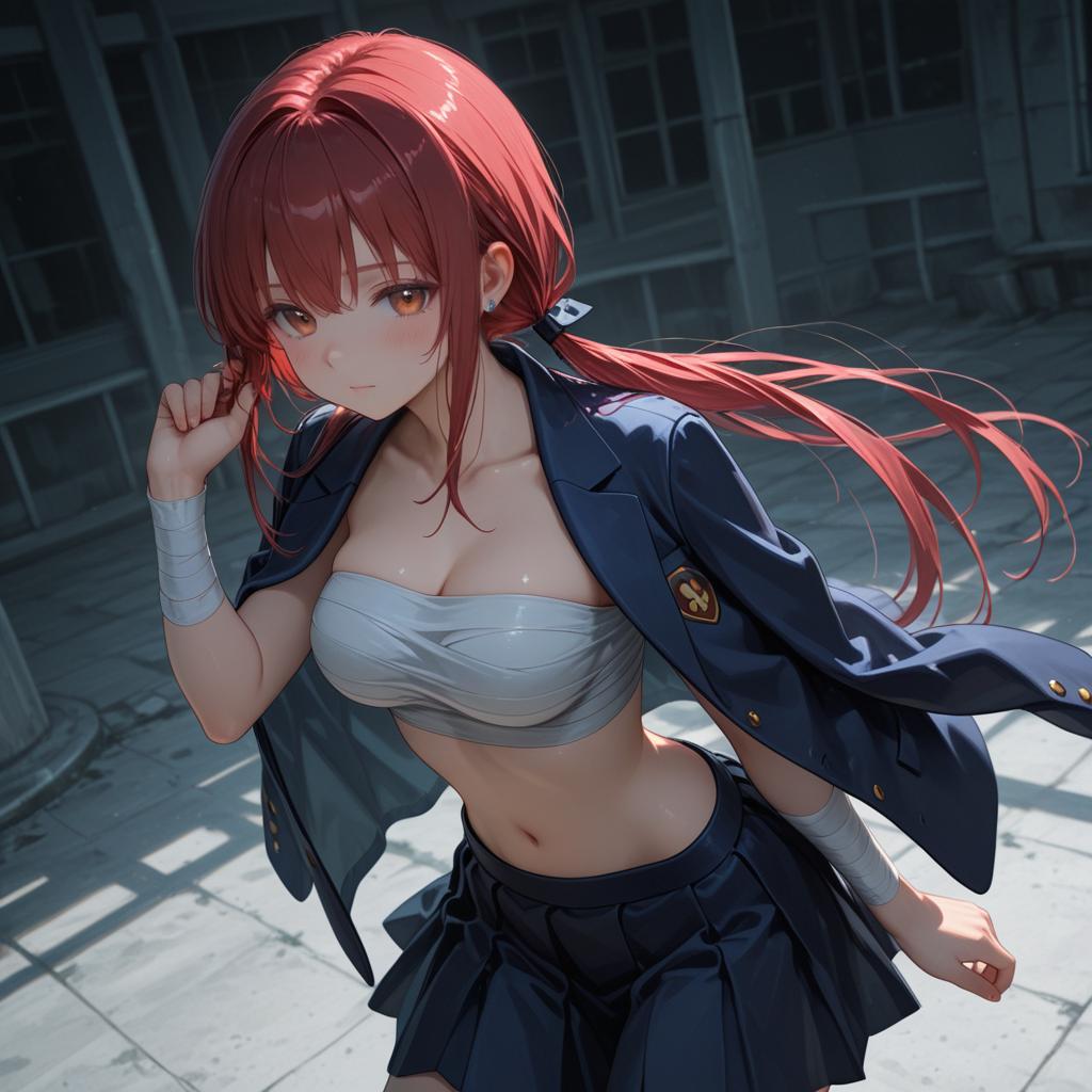 This digital anime-style drawing depicts a red-haired woman with long, flowing hair and amber eyes. She wears a navy blue school uniform jacket with an emblem on the left breast, open to reveal a white bandage-style top that exposes her midriff and large breasts. Her black pleated skirt contrasts with the bright sunlight casting shadows on a stone building in the background. Her right hand is raised to her hair, and her left arm is slightly bent. She has a determined expression, and her skin is fair. The background features a dark, old building with large windows.