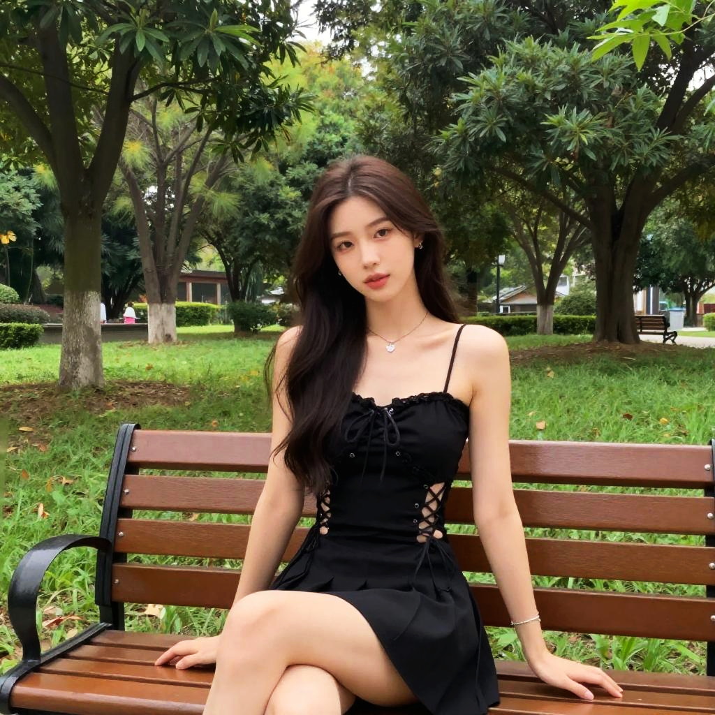 A young woman with long dark hair sits gracefully on a wooden bench in a lush green park. She wears a stylish black dress with lace-up details, set against a backdrop of tall trees and soft sunlight filtering through the leaves.