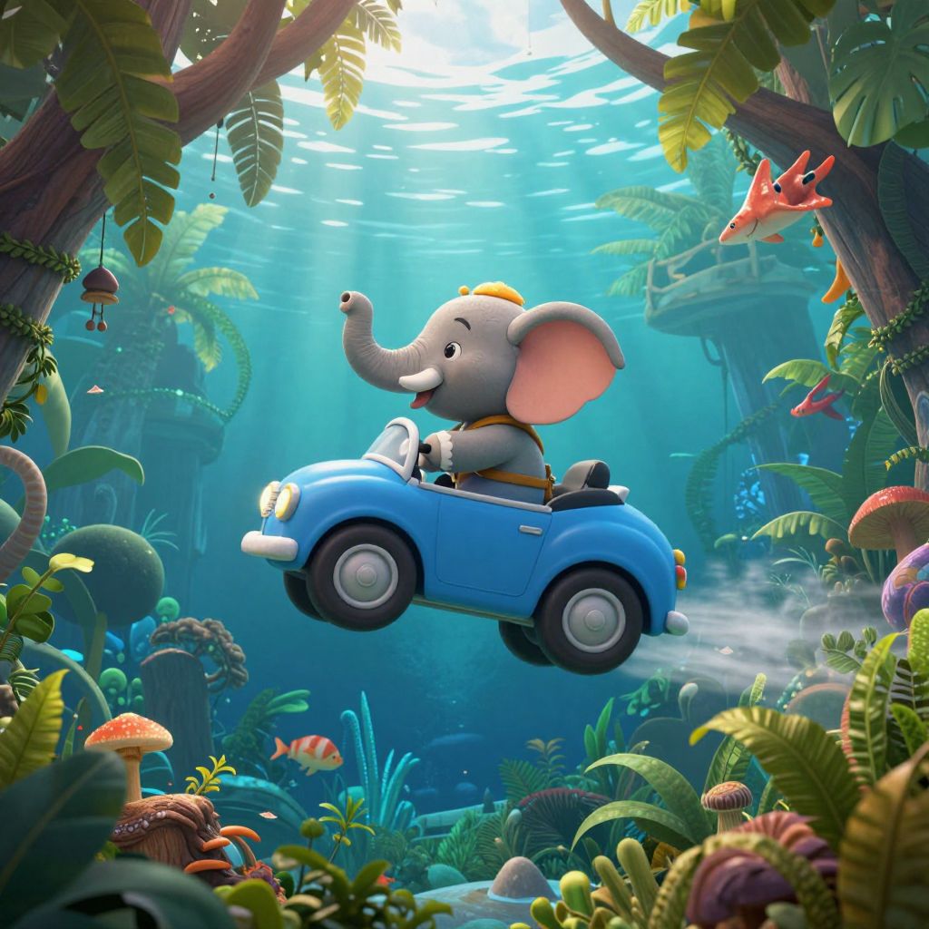 CGI illustration of a joyful cartoon elephant driving a blue toy car through a vibrant underwater jungle, illuminated by sunlight filtering through lush green foliage.