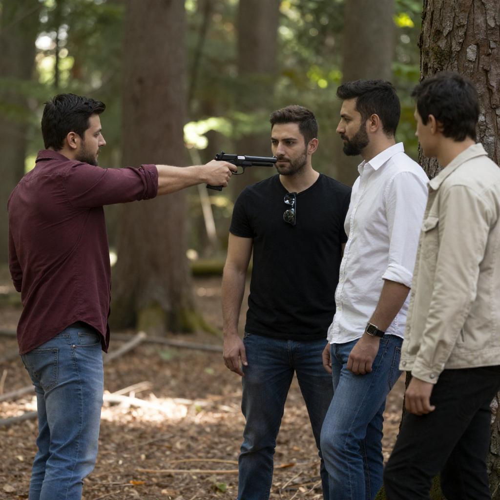 Photograph of a tense street scene: a bearded man in black crouches, reaching for a gun, while a man in a blue shirt and gray pants stands with a defensive posture. A third man in a black coat and hat watches from the background. The setting is a gritty, concrete-walled alley with a door. Bold, red and white overlays the bottom left.