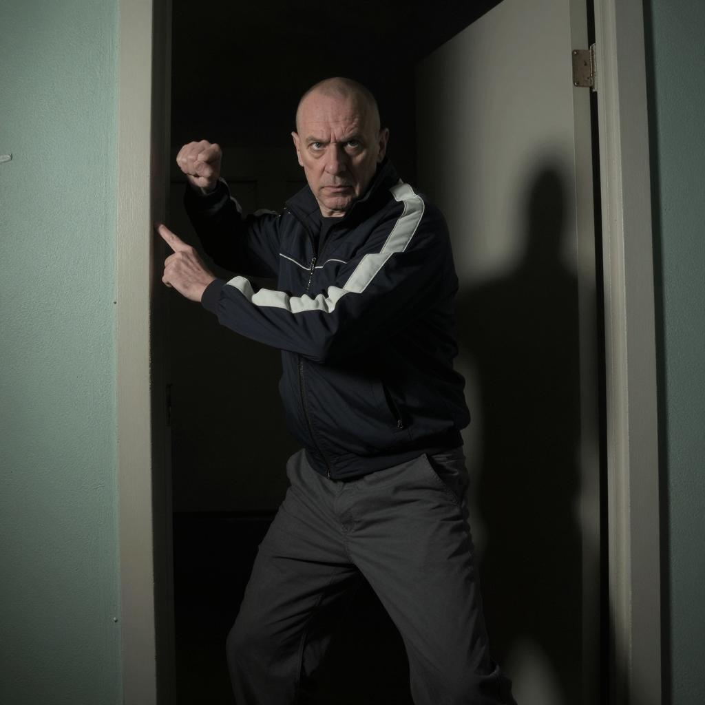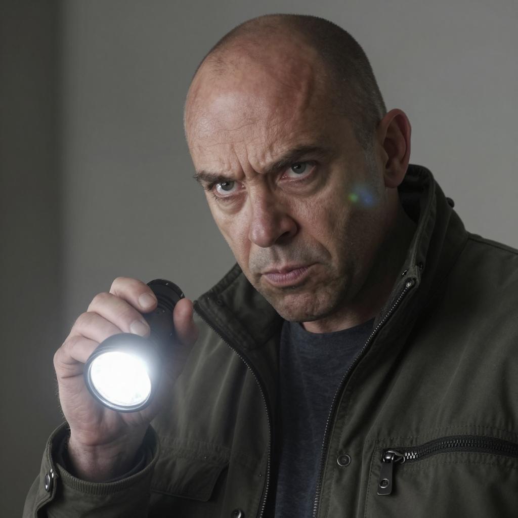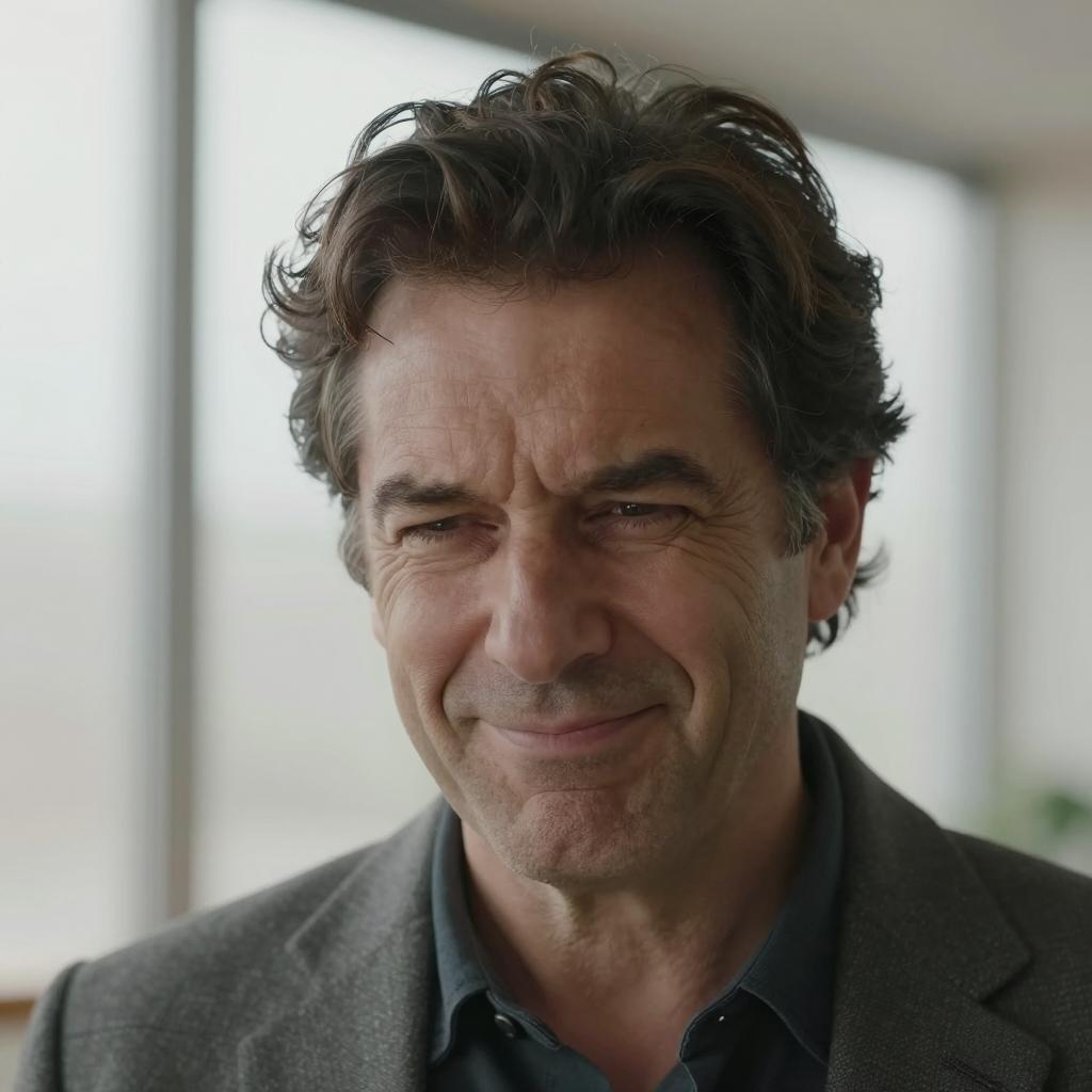 Close-up photograph of an older man with fair skin, bald head, and a wide, slightly mischievous smile. His eyes are slightly squinted. Background is blurred with dim lighting and a faint orange glow. Man's facial expression is intense and slightly sinister.