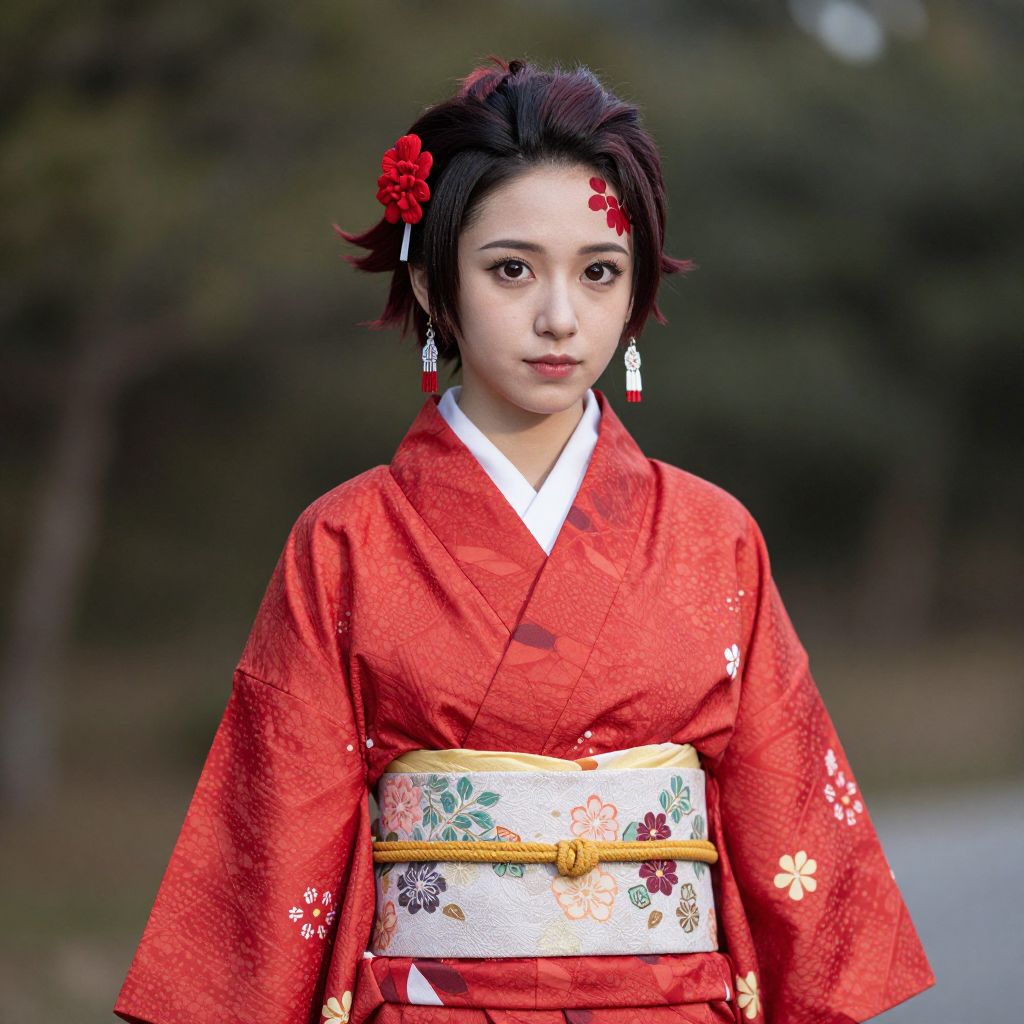 Tanjiro Girl Costume, woman in a red kimono with a red flower in her hair