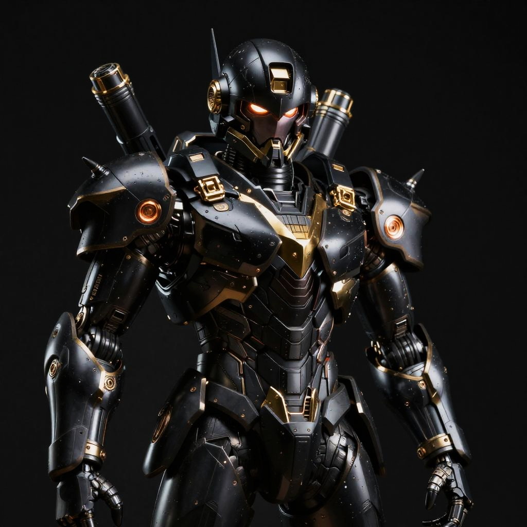 Gilded titan mech pilot with helmet and mask, all-black armor, intimidating face mask and helmet, plain black background, dark black theme, Sony Alpha 1 photography, dramatic, complex details, professional photography, 8k, photo-realistic, octane rendering, global illumination, RTX ray tracing, VFX post-processing