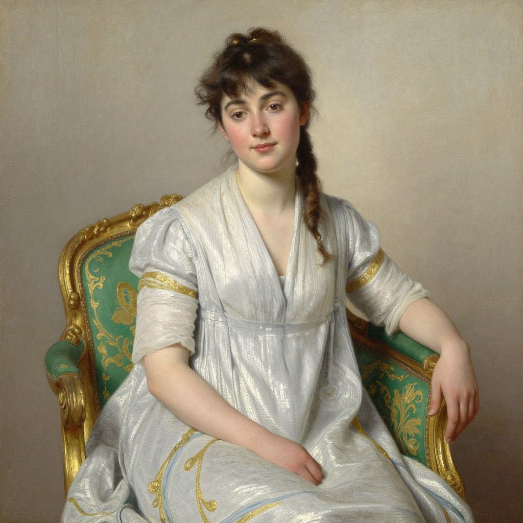 A finely detailed oil painting by Georges Bellanger (1847-1918), showcasing a young woman in classical attire, seated gracefully on an ornate green chair with gold embroidery, rendered with soft, naturalistic lighting and a vintage aesthetic.