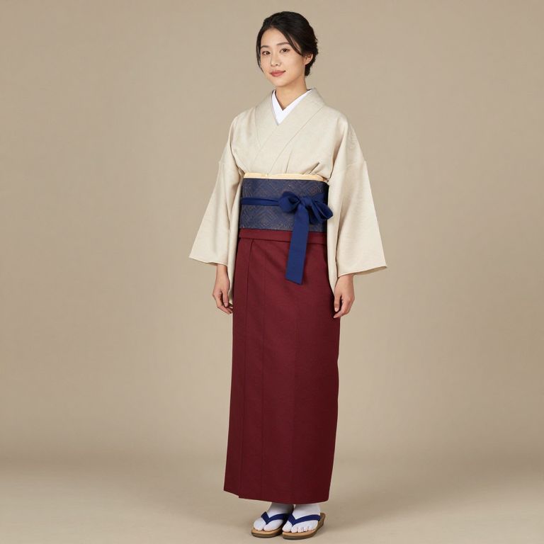 Female wearing a beige kimono with a maroon skirt and a blue ribbon tied around the waist. She is wearing a pair of blue sandals and has her hair pulled back.