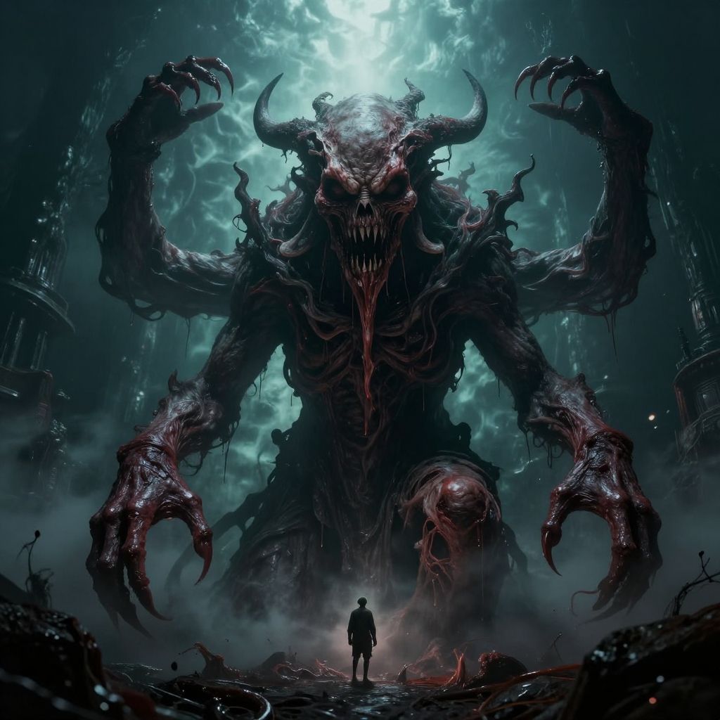 Digital artwork of a towering, dark, horned monster with glowing eyes and massive claws, looming over a small, silhouetted figure in a