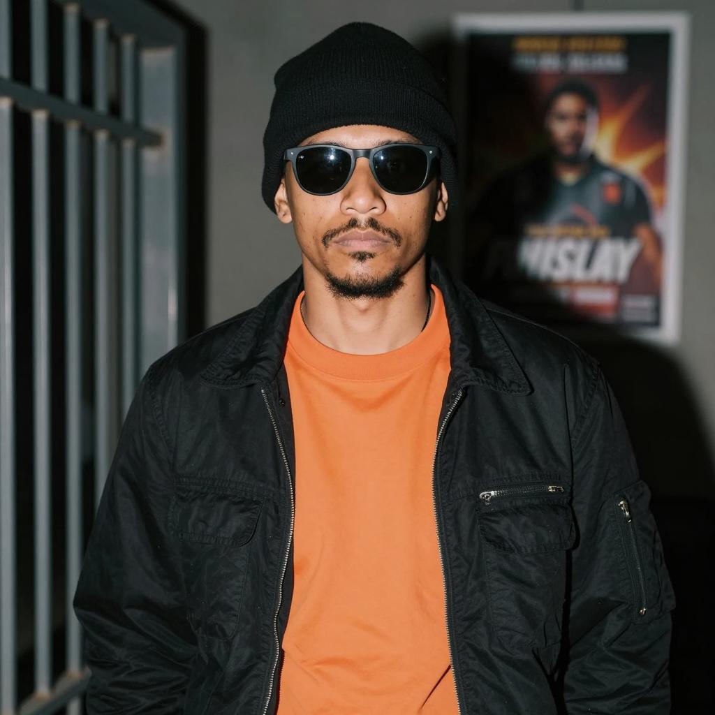 Man with tan skin, wearing a black wide-brimmed hat, black sunglasses, gold necklace, and a sleeveless brown patterned vest. Smiling with arms crossed. Background: colorful graffiti wall with yellow, blue, and pink abstract shapes. Medium: photograph.