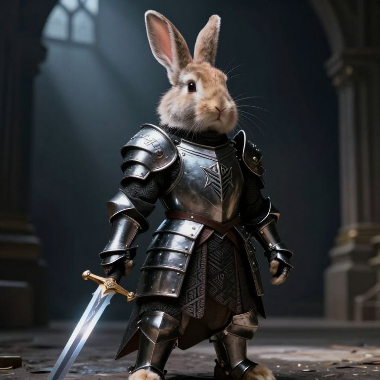 In this captivating image, a rabbit, adorned in a detailed suit of armor, exudes an air of cool confidence. The armor, a blend of dark and metallic hues, is intricately designed with patterns and symbols, adding a layer of mystique to the creature. The rabbit's fur, a soft cream color, contrasts beautifully with the armor, highlighting its delicate features. In its right paw, the rabbit holds a sword, its blade gleaming with a soft blue light, suggesting a magical or enchanted quality. The background is a dark, moody setting, with a hint of a window or archway, allowing a sliver of light to filter through, casting dramatic shadows and enhancing the dramatic effect. The overall composition is dynamic, with the rabbit positioned centrally, drawing the viewer's eye to its regal stance and the sword it wields, creating a sense of tension and anticipation.