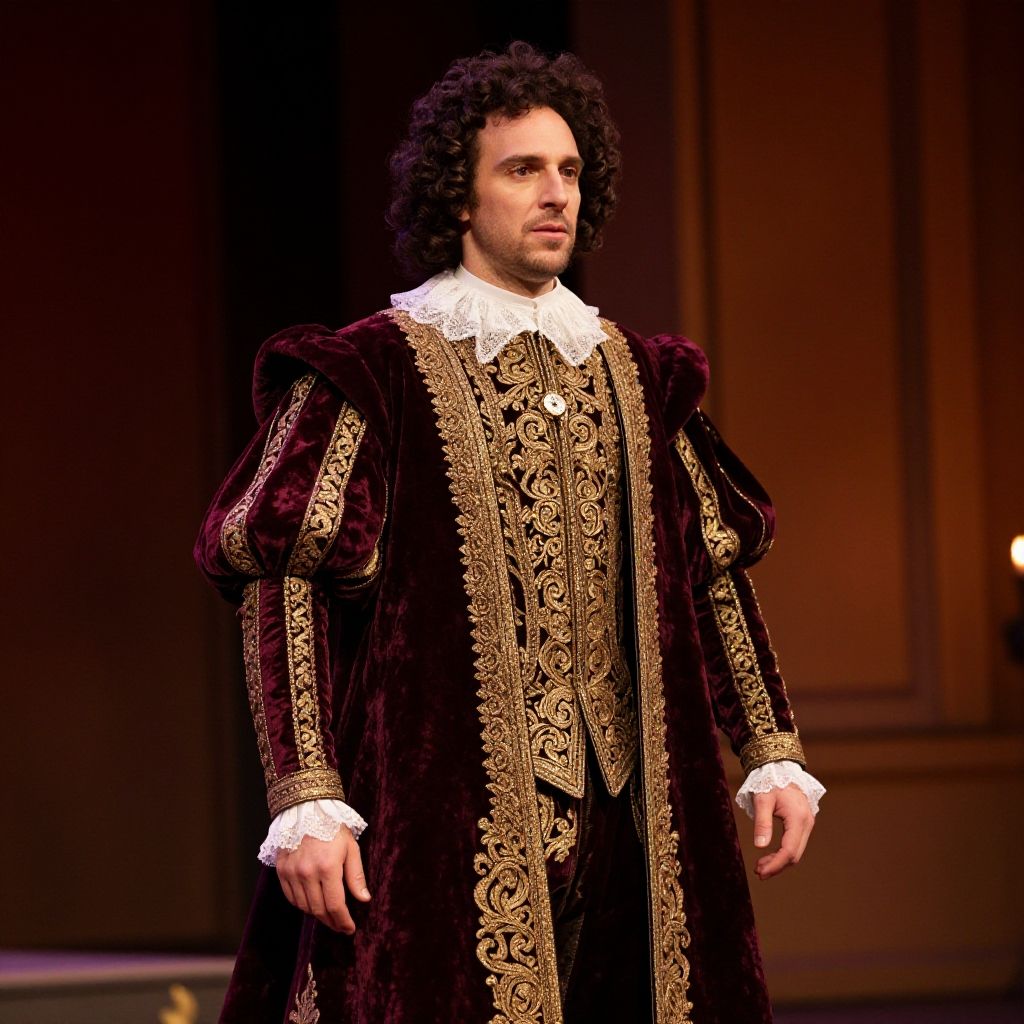 Lord Capulet costume in luxurious Renaissance style, featuring rich velvet fabrics, intricate gold embroidery, and ornate accessories, set against a classic Shakespearean stage background with dramatic lighting and period-accurate details.