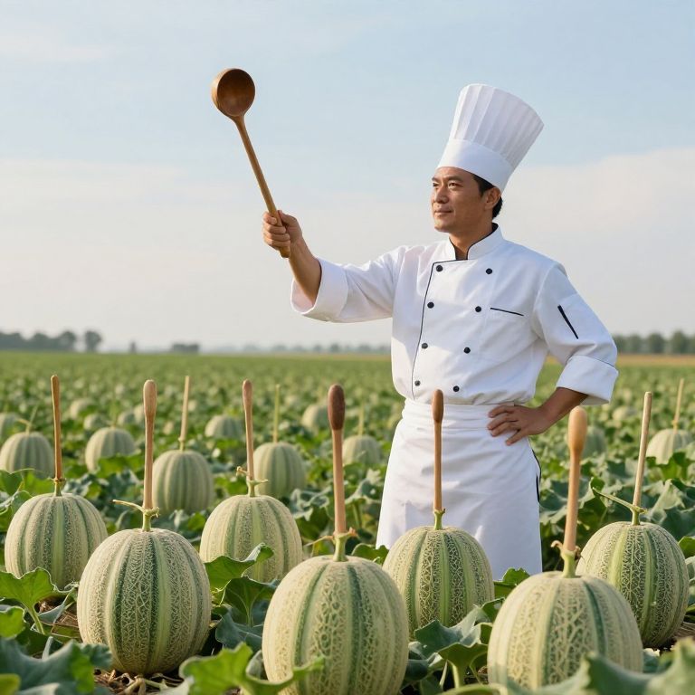 Chef conducts an orchestra of wooden spoons emerging from a field of vibrant green melons, wielding a ladle as a baton under a serene sky.