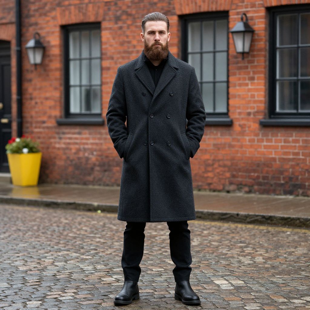Photograph of a bearded man standing on a cobblestone street. He's wearing a long, dark gray overcoat, black pants, and black boots. His hands are in his coat pockets. The background features a red brick building with black-framed windows and lanterns, and a yellow flower pot on the left. The street is slightly wet, suggesting recent rain. The man has a serious expression and neatly styled hair.