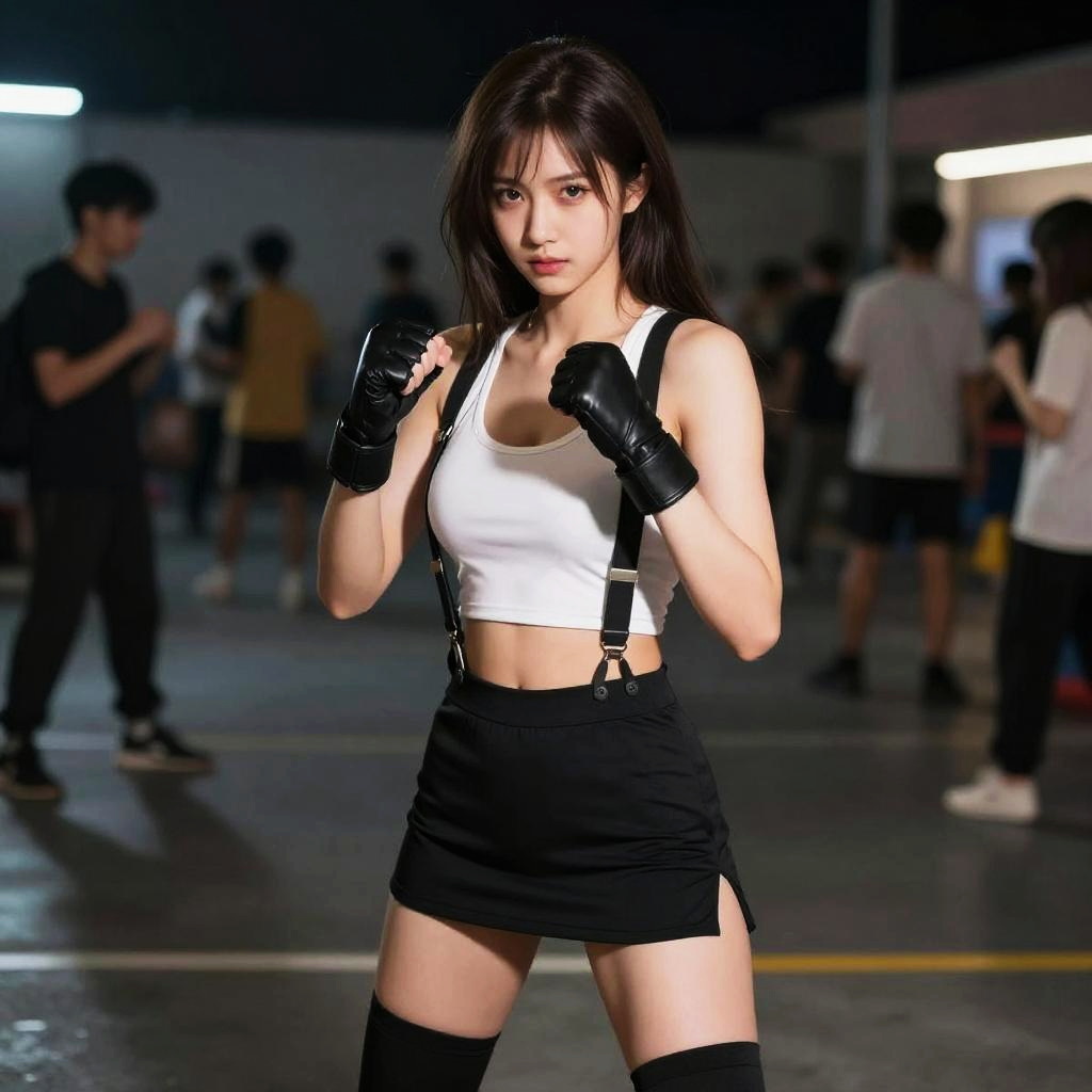 Realistic, realistic details, detailed, (((1 girl, cute, solo focus, delicate, beautiful, slender, thin thigh, thigh gap, long hair, large breast, cleavage, (((xtfa))), ((tifa lockhart)), black thigh high, white tank top, navel, (((black skirt))), suspenders, suspender skirt, glove, black shoes, fight stance, night, perspective, blurry background, depth of field, focus on face, sharp focus)))