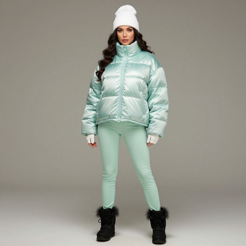 "Woman, winter chic, iridescent mint green puffer jacket, oversized fit, high collar, white wool beanie, coordinating mint green skinny pants, fur trim at the cuffs, black snow boots, gloves, studio background.. Sexy. Pretty face and beаutiful eyes. Big breasts."