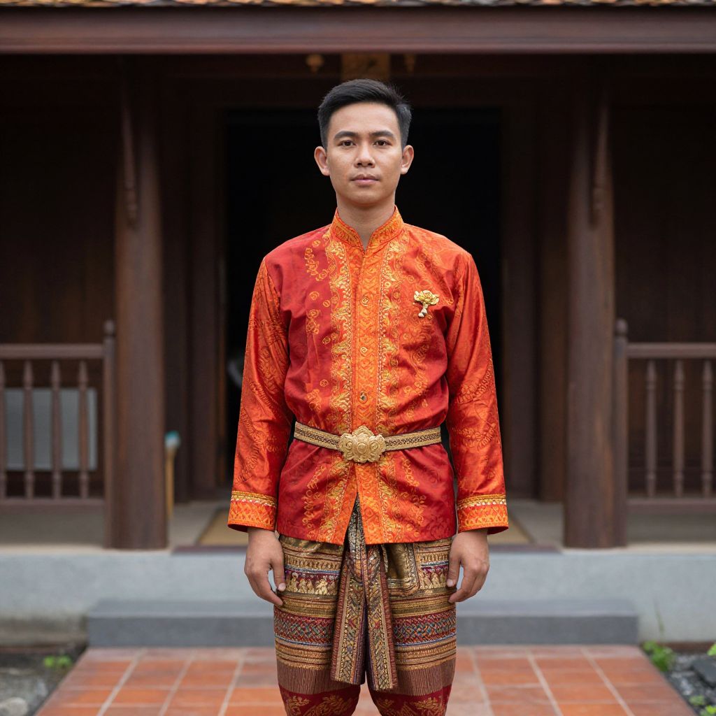 Photograph of an Asian man standing in front of a wooden building. He wears a vibrant red, long-sleeve, embroidered traditional shirt with gold patterns, and a matching wide belt with a gold buckle. His black hair is neatly styled. He also wears ornate, patterned brown and red trousers. The background features a wooden porch with dark brown beams and a concrete path. The man's expression is neutral, and he stands with his hands by his sides. The image has a crisp, colorful, and detailed style.