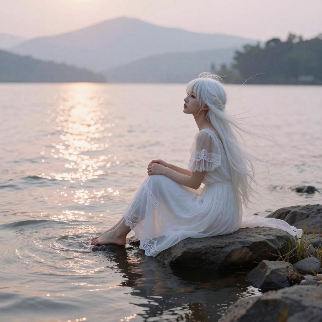 Photograph of a silhouetted figure standing on a rocky cliff at sunset. The person, with long flowing white hair, wears a white, loose-fitting robe and white sandals. They are facing left, gazing at the orange and pink-streaked sky with the sun low on the horizon. The clouds are illuminated, creating a dramatic contrast against the darkening landscape. The rocky cliff has sparse grass and small plants. The figure's serene expression and ethereal appearance evoke a sense of tranquility and spiritual connection to nature.