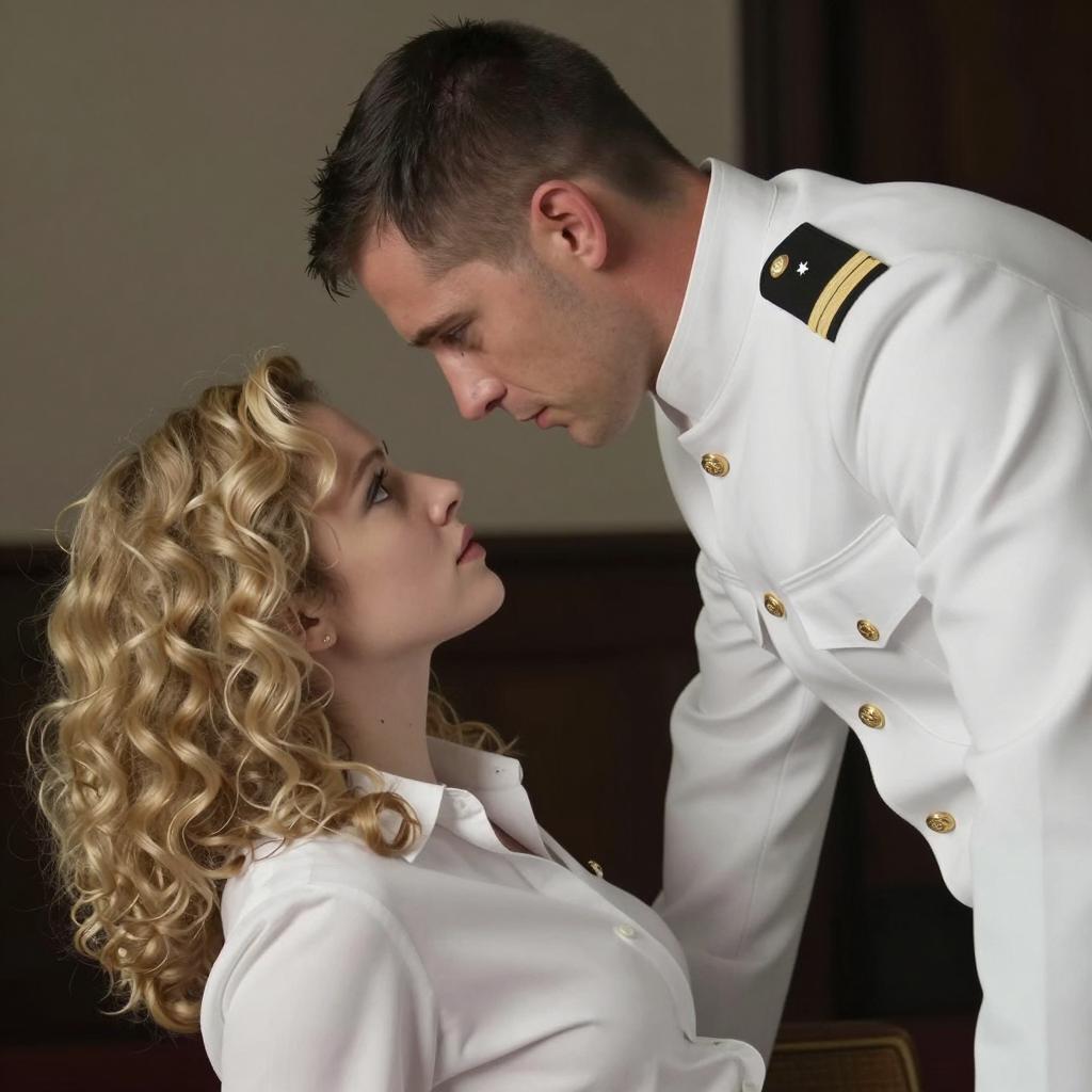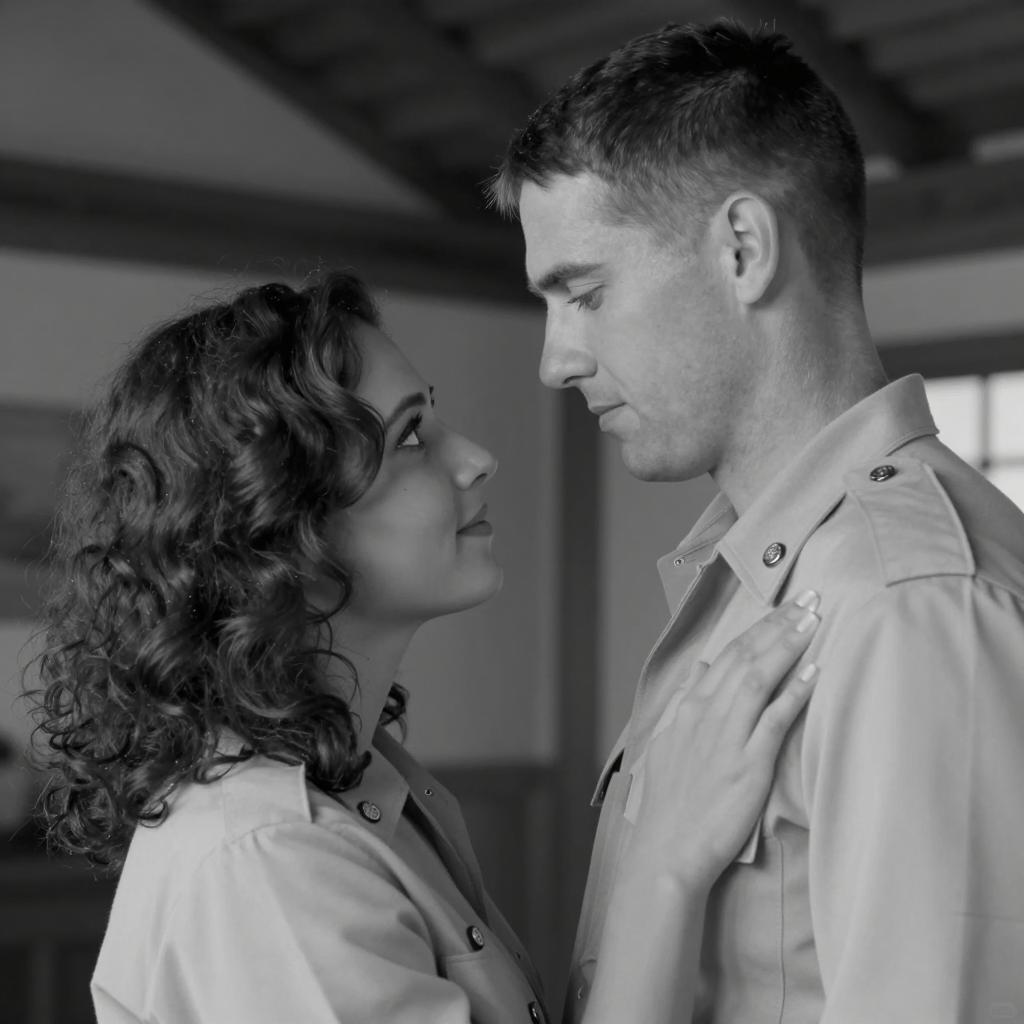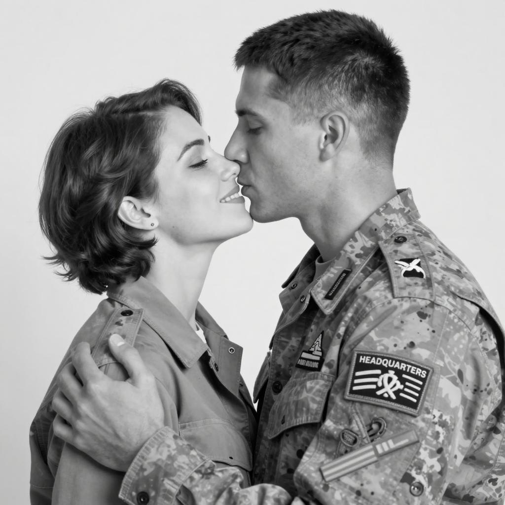Photograph of a smiling couple. Woman with short blonde hair, light blue top, facing left, laughing. Man with dark hair, light beige military uniform, patches on right shoulder, facing right, smiling. Woman's right arm around man's back. Plain white background.